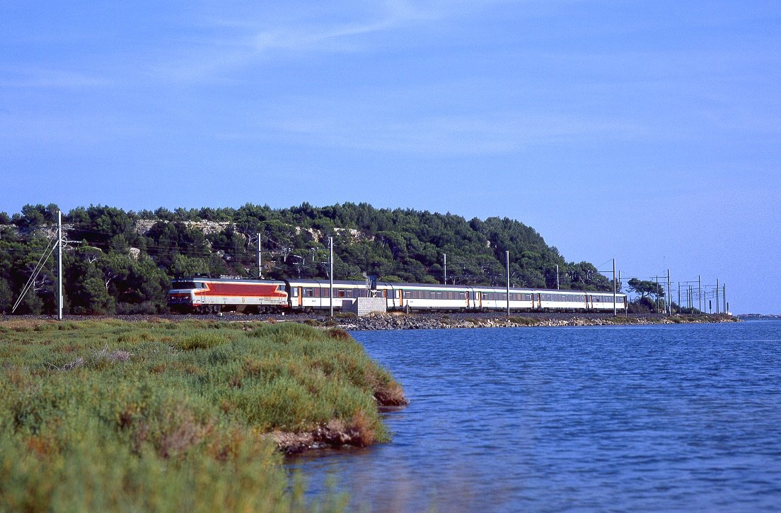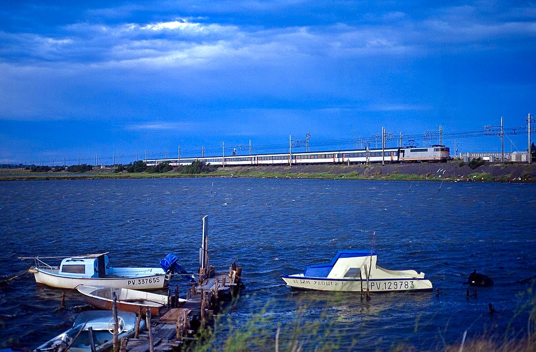 Ein Zug, gebildet aus Talgo-Wagen und gezogen von der SNCF 7283, im Jahr 1988 auf der Strecke Perpignan-Narbonne in Höhe von Salses-le-Chateau. Ernst Lauer