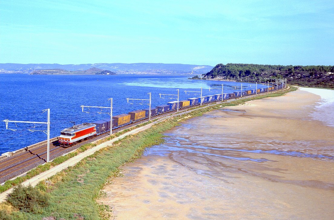 Die SNCF Zweisystemelektrolok BB 26198 durchfährt am 16.09.2002 auf der Strecke von Narbonne nach Perpignan und den Grenzbahnhof Cerbères den kleinen südfranzösischen Bahnhof Salses. Diese bis 1998 von Alsthom in Belfort gebaute Baureihe wurde auch Sybic genant, während die grau-orangefarbene Lackierung den Namen "Livrée béton" erhielt (Quelle: Wikipedia) Ernst Lauer