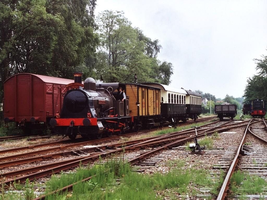 Bellerophon (Vintage Carriages Trust) auf Bahnhof Haaksbergen am 1-6-2000. Diese Lok ist auf eine Tiefladeanhänger von Großbritannien nach die Museumsbahn MBS in Haaksbergen gefahren. Die MBS hat nämlich keine Anschluß mit dem Eisenbahnnetz. Bild und scan: Date Jan de Vries. Date Jan de Vries