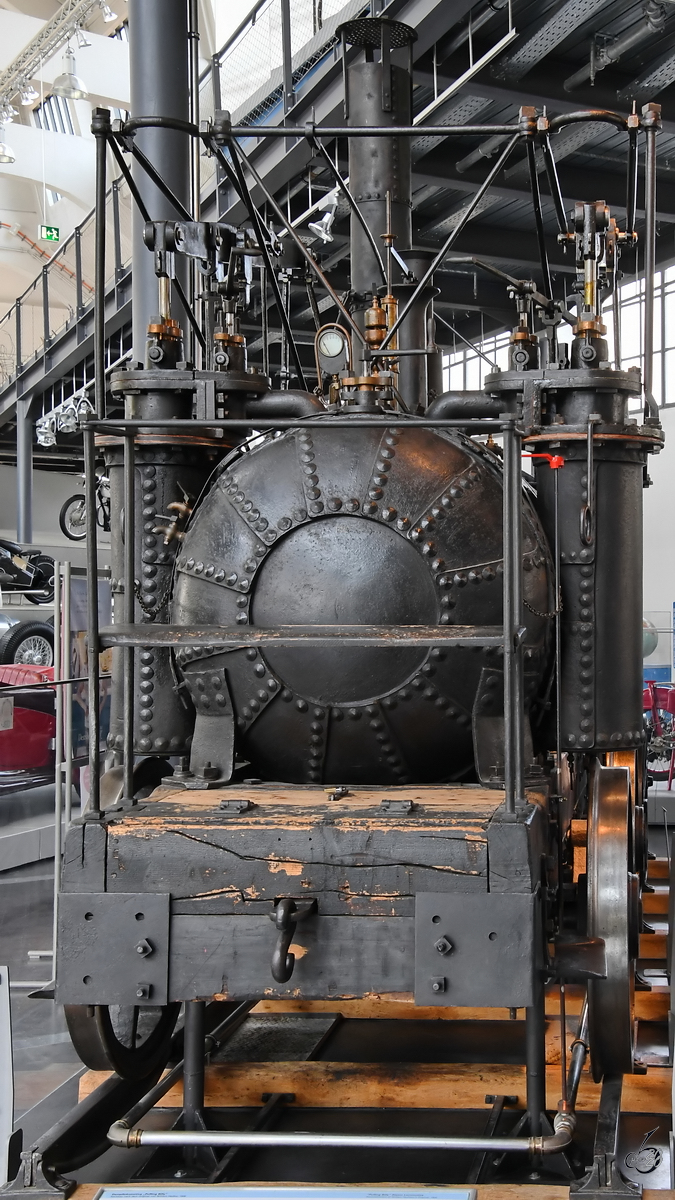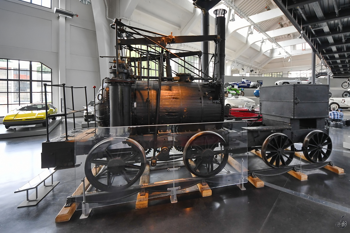 Als erste gebrauchsfähige Dampflokomotive der Welt gilt die 1814 gebaute "Puffing Billy". Im Verkehrszentrum des Deutsches Museums München ist ein Nachbau der Zentralwerkstätte der Bayerischen Staatsbahnen aus dem Jahr 1906 zu sehen. (August 2020) Christian Bremer