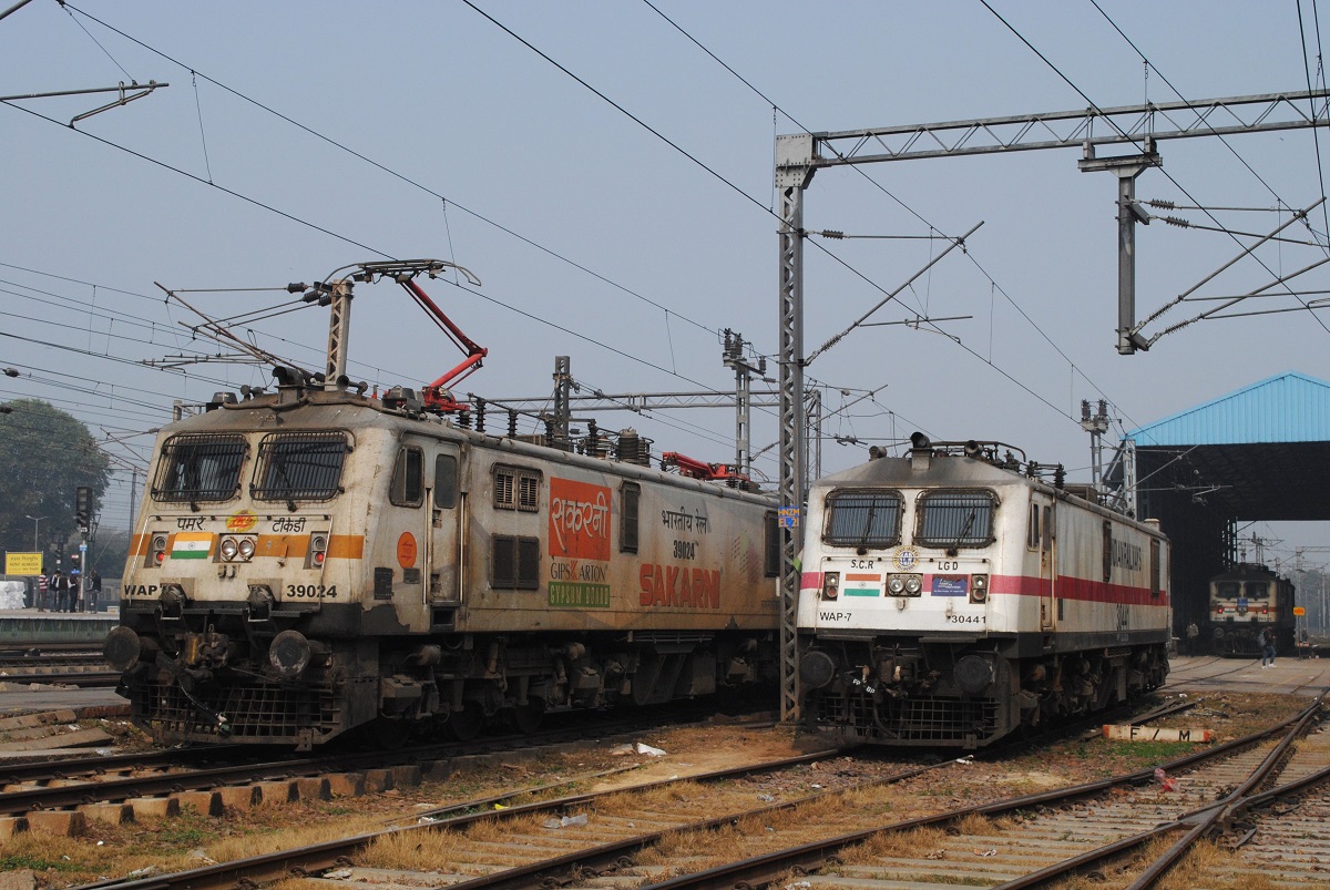 WAP-7 39024 und 30441 warten im Bhf. Delhi - Hazrat Nizamuddin auf neue Einsätze. (29.01.2024)