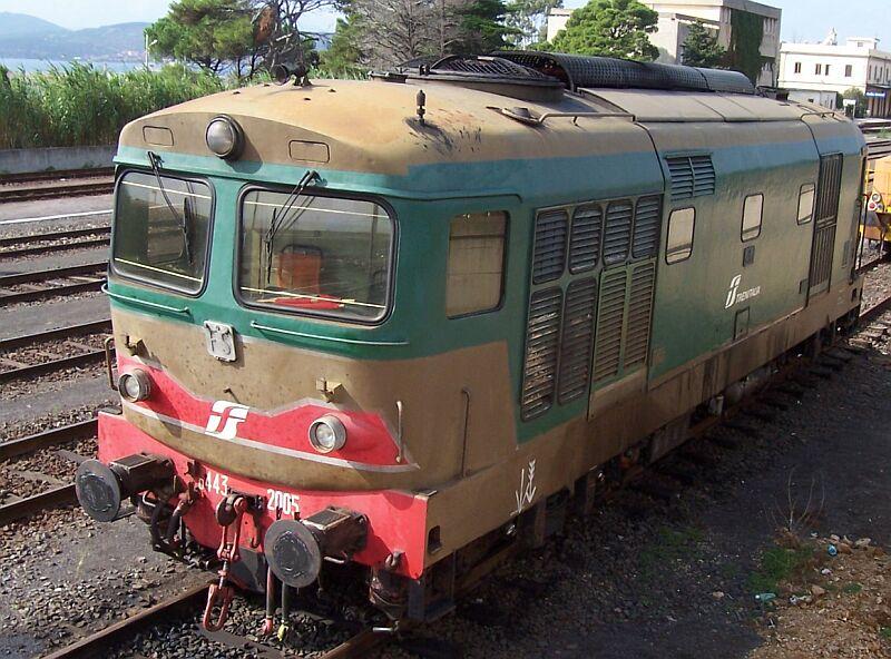 Drei Dieselloks Baureihe D 443, vorn D 443.1019, fahren mit Güterzug von Golfo Aranci kommend am 18.10.2005 durch den Bahnhof Olbia in Richtung Süden. Alle Güter, die mit der Bahn befördert werden und vom italienischen Festland kommen, werden mit Schiffen der Staatsbahn nach Golfo Aranci gebracht und von dort weiter befördert. Günther Glauz