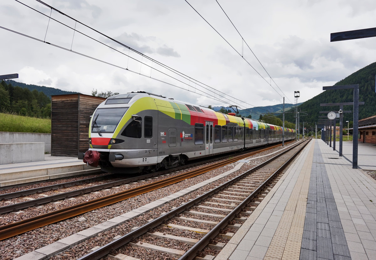 Ein ETR 170 der SAD hält als R 1858, auf der Fahrt von Lienz nach Fortezza/Franzensfeste, im Grenzbahnhof San Candido/Innichen.