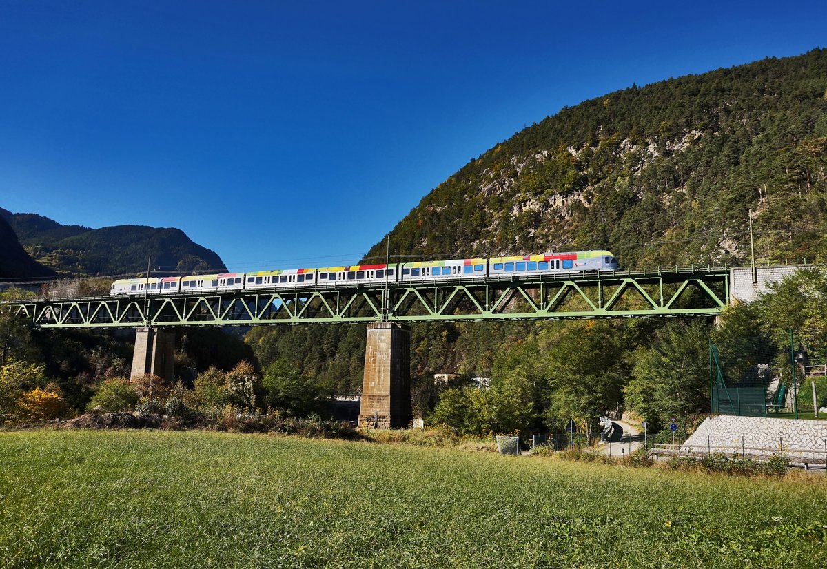 Bei strahlenden Sonnenschein fährt ein ETR 170 fährt als REX 1885 (Fortezza/Franzensfeste - Lienz) vorüber.