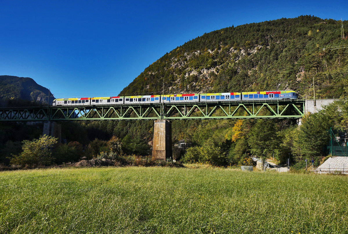 Ein ETR 170 überquert bei Fortezza/Franzensfeste den Fluss Eisack. Unterwegs war die Garnitur als R 1885 (Fortezza/Franzensfeste - Lienz). Aufgenommen am 16.10.2016.