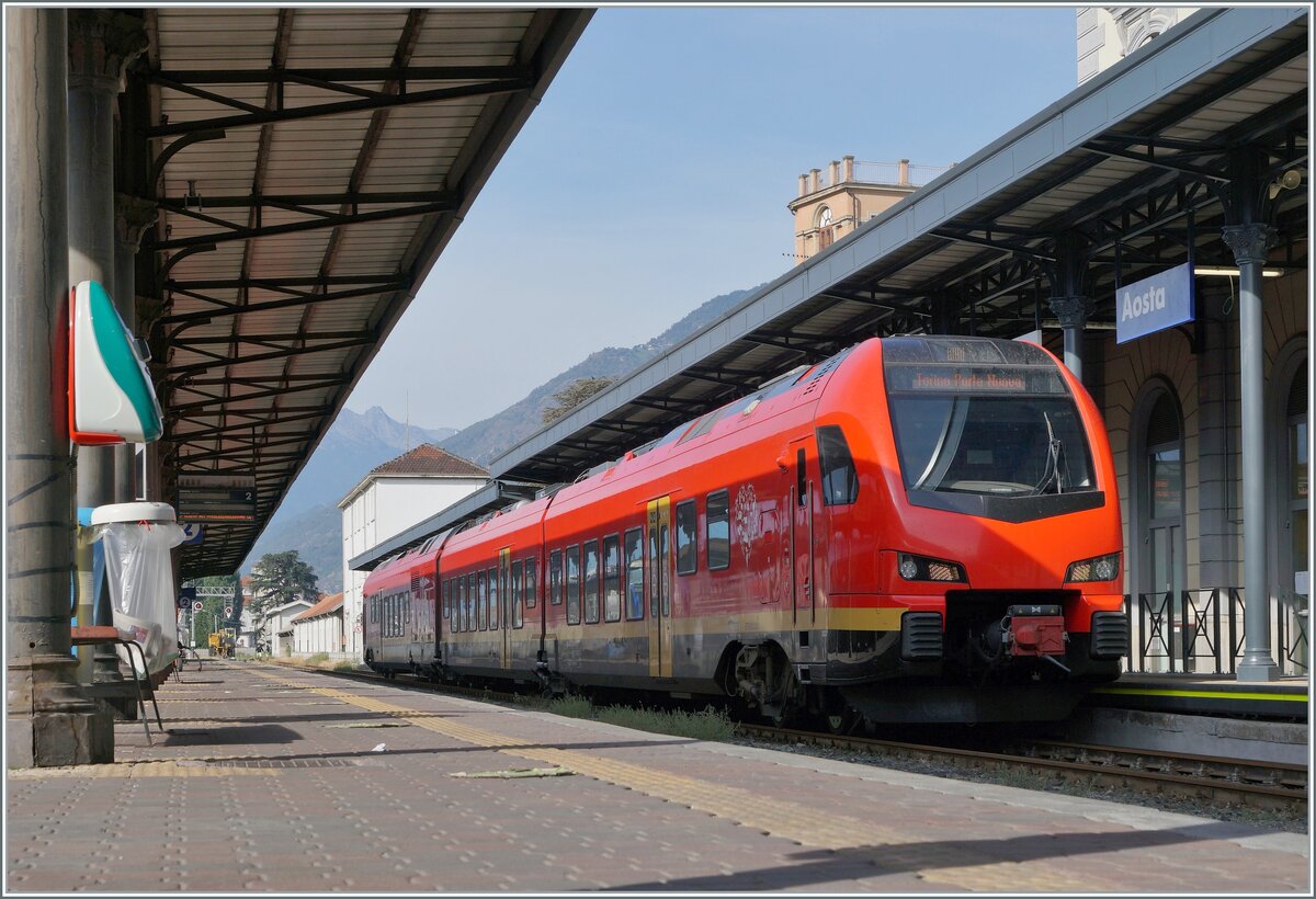 Der bimodulare FS Trenitalia BUM BTR 813 003 verlässt als Regionale 2722 den Bahnhof von  Aosta mit dem Ziel Torino Porta Nuova. Der Zug kann mit Dieselmotoren oder elektrisch mit 3000 Volt Gleichstrom betrieben werden, verfügt für die Achsanordnung Bo' 2'2'2' Bo' und die UIC Bezeichnung (des Antriebsmodul) lautet 90 83 1813 012-1 I-TI.