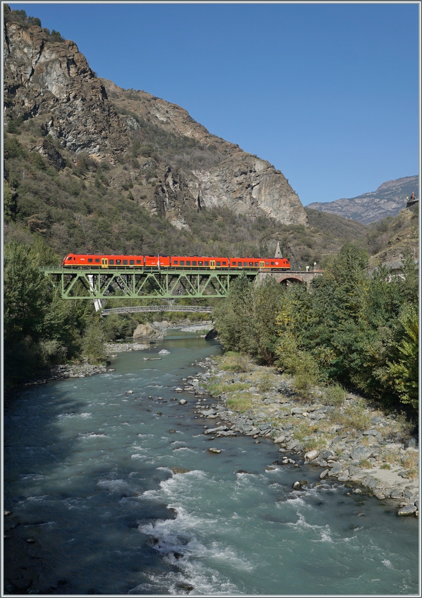 Heute, beim Einstellen dieses Bildes verkehren ein letztes Mal Reisezüge im Aostatal, ab morgen wird der Betrieb für drei Jahre eingestellt und die Strecke Ivrea - Aosta elektrifiziert. Beim kleinen Ort Parleaz im Aosta Tal ist der FS Traniatlia Minuetto MD Aln 501 011 auf dem Weg von Ivrea nach Aosta. 11. Okt. 2023