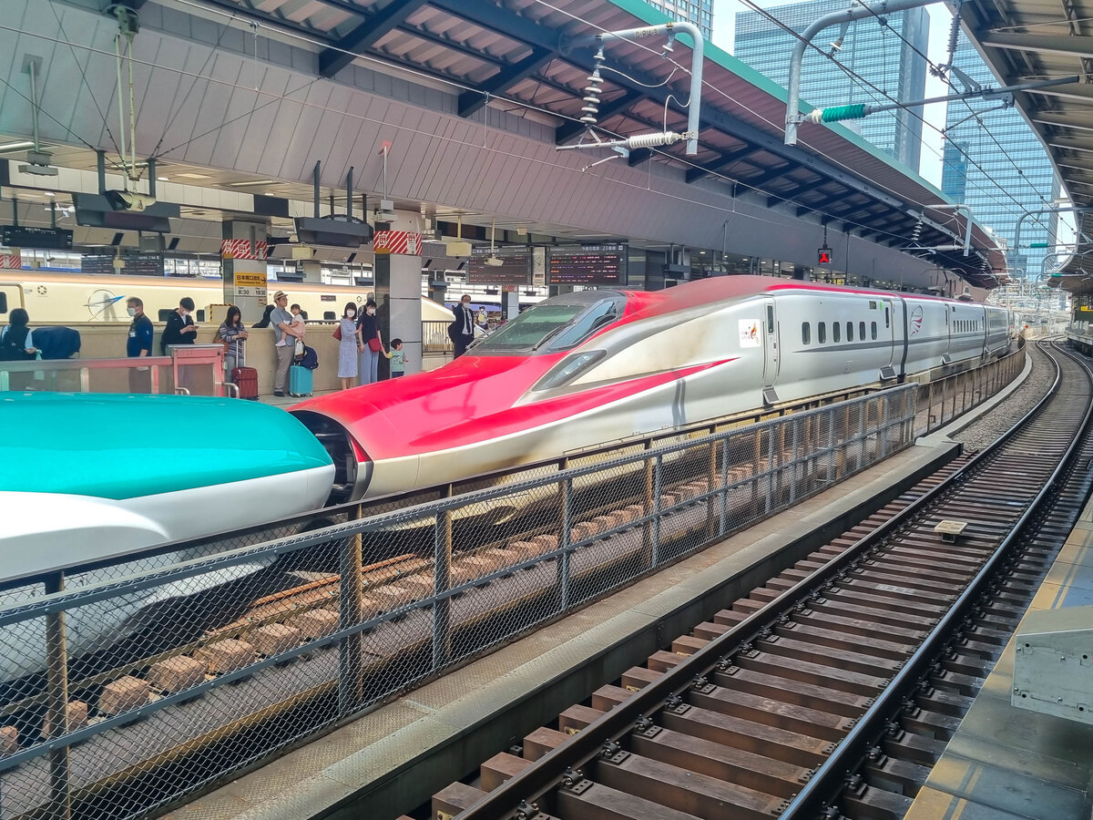 Ein Akita Shinkansen steht im Bahnhof Tokyo zur Abfahrt bereit in Richtung Akita. Er ist mit einem Zug des Tohoku Shinkansen zusammengekuppelt. In Morioka werden die Züge getrennt und letzterer fährt in Richtung Shin-Aomori weiter. Tokyo, 29.04.2024. Eisen Bahn