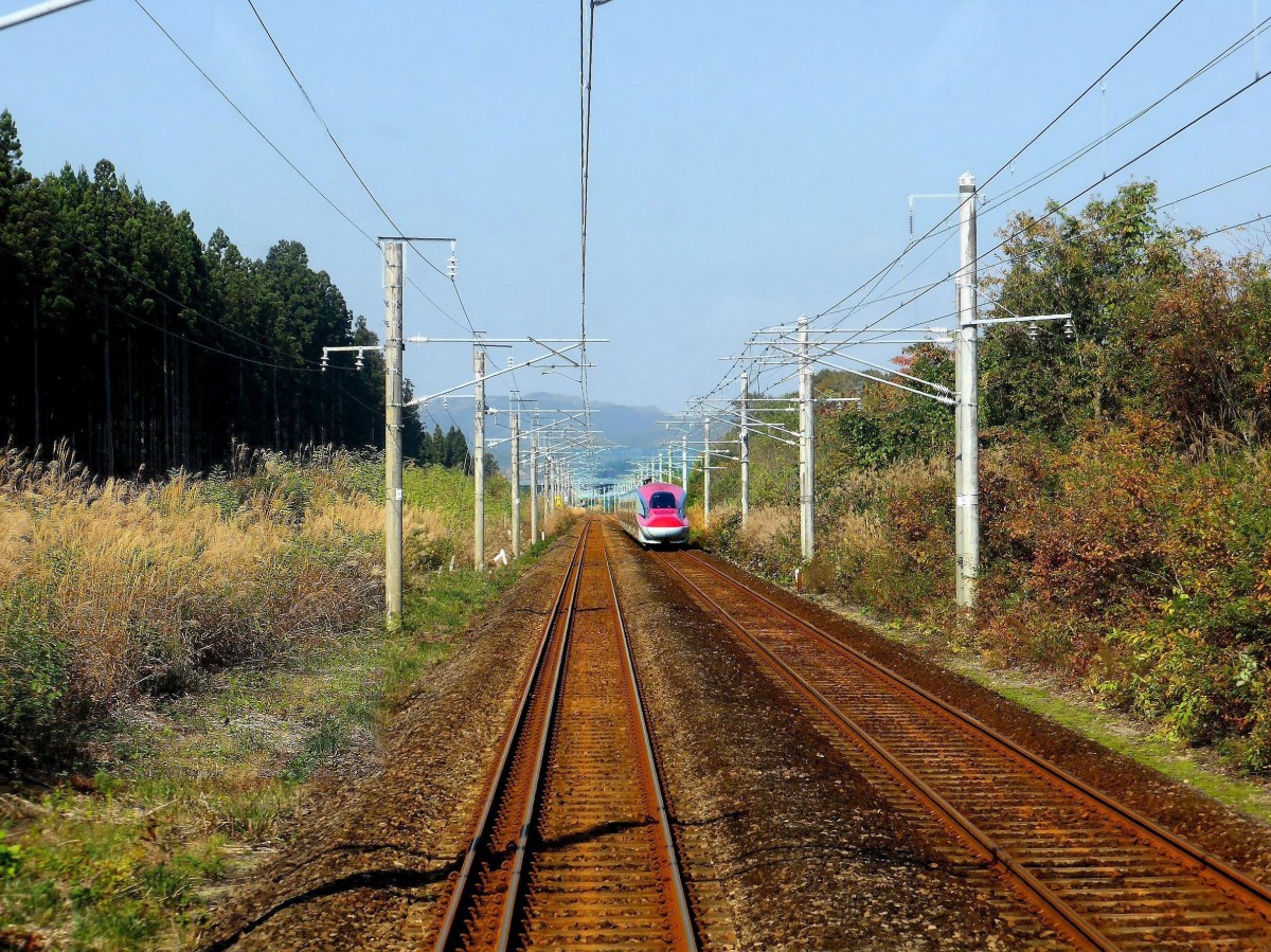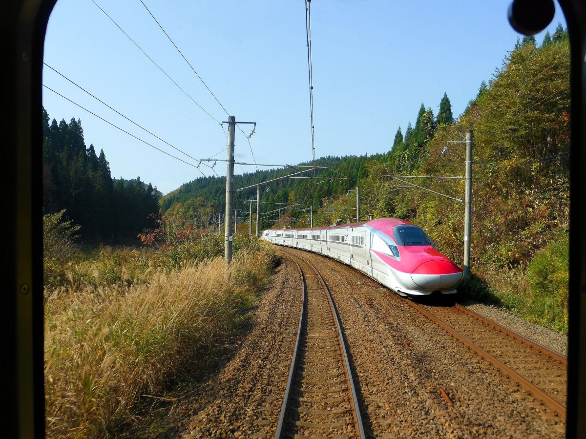 Serie 701 des Bezirks Akita - auf gemischter Spur: Die Strecke von Akita landeinwärts ist gemischt-spurig; der Photograph fährt im 1067mm-Spur-Zug 701-30 auf Dreischienengleis, während ein 1435mm-Spur Shinkansen-Zug Typ E6 von Tokyo nach Akita kreuzt. Nach rund 52km ab Akita zweigt die 1067mm-Spur nach Süden auf die Nord-Süd-Inlandlinie ab, während der Shinkansen (und ganz wenige normalspurige Lokalzüge Serie 701-5000) nach Osten Richtung Morioka weiterfahren. Bild bei Kariwano, 5.November 2013. Peter Ackermann