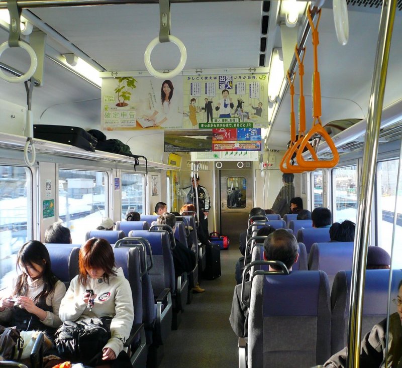 JR Serie 721: eines der beiden, gegen Kälte geschützten Abteile (sonst unüblich in Japan, wo die Wagen meist nicht unterteilt sind) des neueren Wagens MOHA 721-5201 (MOHA-motorisierter Zwischenwagen). 16.Februar 2009. Peter Ackermann