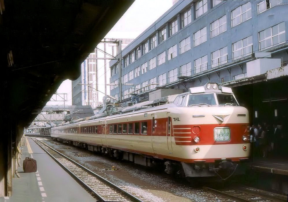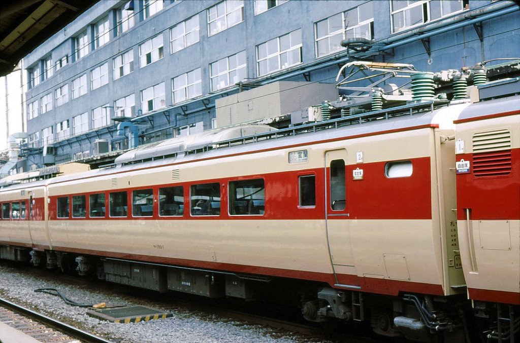 Serie 781: Wechselstromzug (20 kV/50 Hz) der ehemaligen Staatsbahn für die im Winter sehr kalte und schneereiche Nordinsel Hokkaido, gebaut 1978/1980; insgesamt 48 Wagen. Bis 2007 durch neuere Züge ersetzt. Im Bild wartet der von KUMOHA 781-1 geführte Zug in Sapporo auf Abfahrt nach Muroran, einer Industriestadt an der Südküste von Hokkaido; die Stirnfronttafel trägt den Zugsnamen "Lilac" (engl. "Flieder"). 20.September 1984. (KU ク= mit Füherstand, MO モ= mit Motor, HA ハ= mit gewöhnlichen Sitzplätzen) Peter Ackermann
