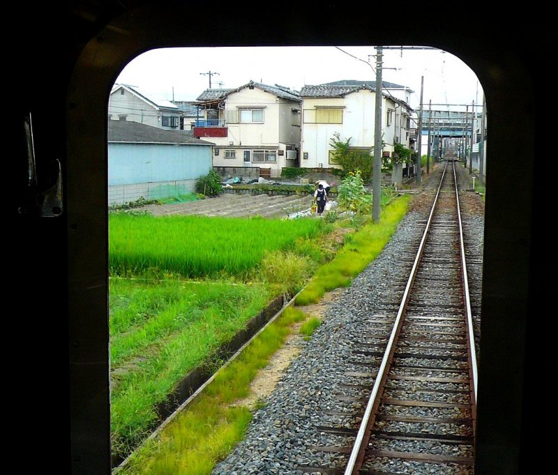 Die Mizuma-Bahn: Diese Bahn am äussersten Rand des Grossraums Osaka fährt durch eine Landschaft, die aus einem Gemisch von letzten Bauernhöfen, kleinen Siedlungshäusern und Wohnblöcken besteht. Dieses aus dem Zug 1002 aufgenommene Streckenbild zeigt noch kleine Reisfelder inmitten der Häuser; Kaizuka Shiyakusho-mae, 16.August 2008. Peter Ackermann