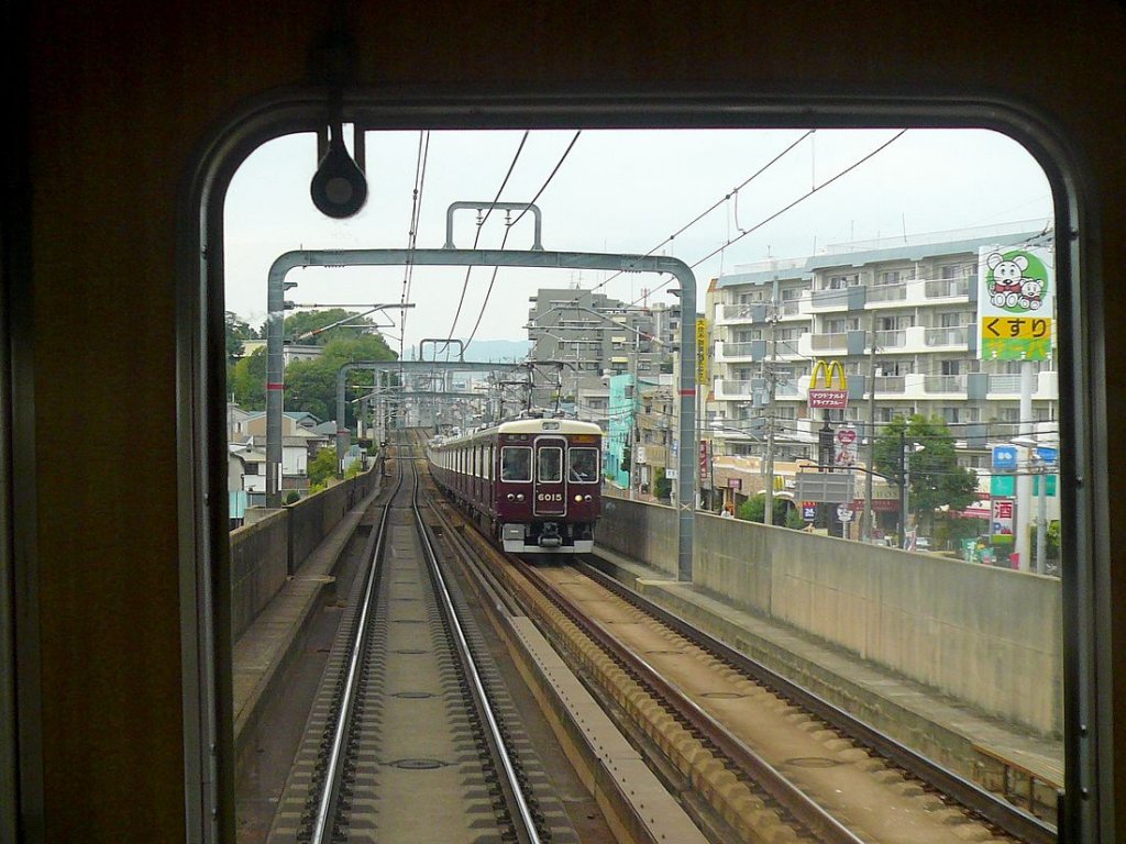 Der Hankyû-Konzern - Serie 6000: 1976-1980/5 gebaut (130 Wagen) für die Linien nach Kobe und Takarazuka. 1435 mm Spur, Gleichstrom 1500 V. Einige Wagen aus anderen Serien eingefügt, einige beim Erdbeben 1995 zerstört. Hier kommt 8-Wagenzug 6015 von Takarazuka her; Osaka-Toyonaka, 28.September 2009. Peter Ackermann