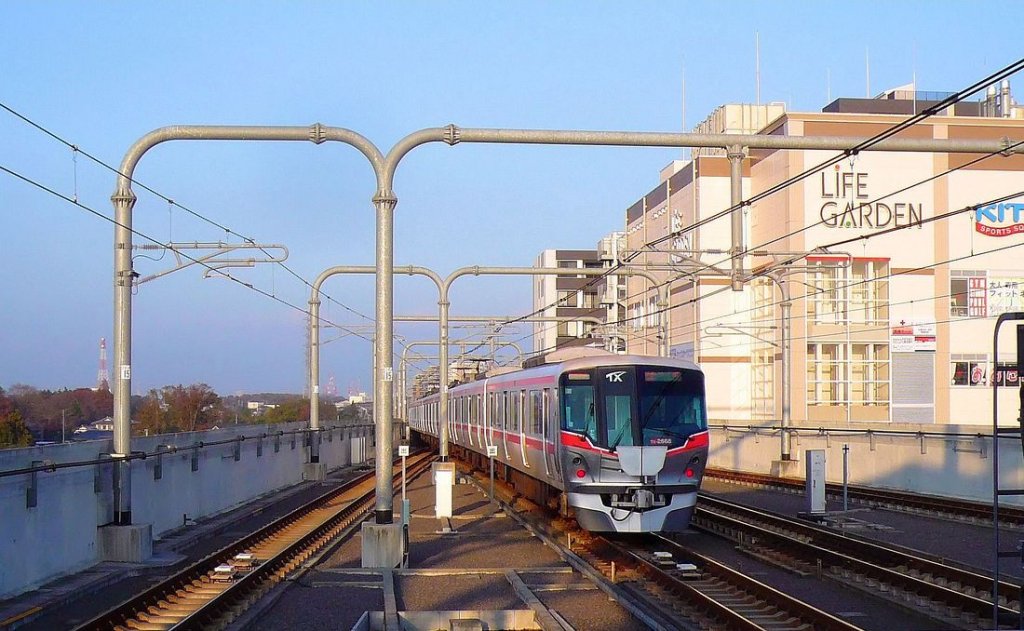 Tsukuba Express Serie 1101: 14 6-Wagenzüge (1101-1114), ab 2003 für den Gleichstromabschnitt von Tokyo bis Moriya (km 37,7) gebaut. Bild: Zug TX 1113 in Kashiwa-no-ha Campus, 25.Juni 2011. Im Hintergrund die örtliche Hochzeitszeremonienhalle.