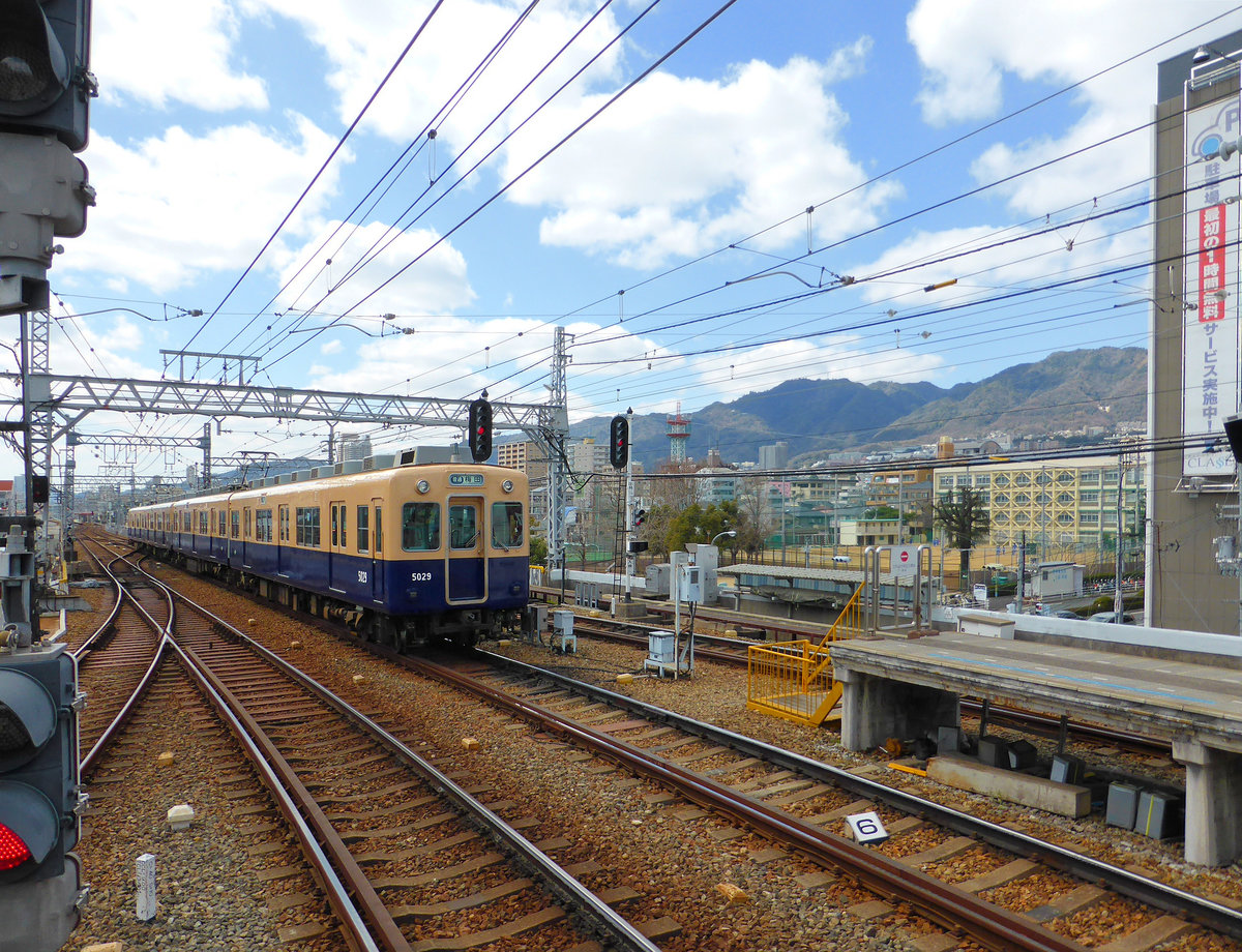 Hanshin Konzern (1435 mm Spur, Gleichstrom 1500V): Einfahrt des Expresszuges 8241 (Serie 8000) in Mukogawa. Serie 8000 bestand ursprünglich aus 21 6-Wagenzügen, gebaut 1984-95 für Express-Dienste. Im schrecklichen Erdbeben von Kôbe am 17.Januar 1995 wurden 66 Wagen dieser Serie zerstört oder beschädigt, 15 Wagen konnten nur noch verschrottet werden. Die restlichen Wagen wurden zu 19 Zügen zusammengestellt, teils mit neu gebauten Fahrzeugen. Die Lieferungen erfolgten mit stetigen Erneuerungen, Zug 8201 (1984), 8211-15 (1984-86), 8217-31 (1986-90), 8233-49 (1991-95); nach dem Erdbeben mussten 3 neue Wagen erstellt werden, statt 8223 mit der Nr. 8523, und und 2 Wagen neu für Zug 8235 (8336+8536). Die Züge der Serie 8000 verkehren auch über den Sanyô-Konzern bis zu deren Endstation in Himeji. 22.März 2014 Peter Ackermann