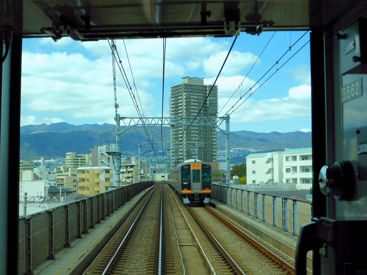Hanshin Konzern: Der Schnellzug 9203 (Serie 9200, Baujahr 1996) in der typischen Landschaft zwischen Ôsaka und Kôbe, am Fusse des Rokkô-Gebirges. Hier im relativ vornehmen Ortsteil von Kôbe in Nishinomiya ist die Bahn bereits zur Hochbahn umgebaut. 22.März 2014. (Bild durch die verglaste Führerstandrückwand eines Gegenzugs) Peter Ackermann