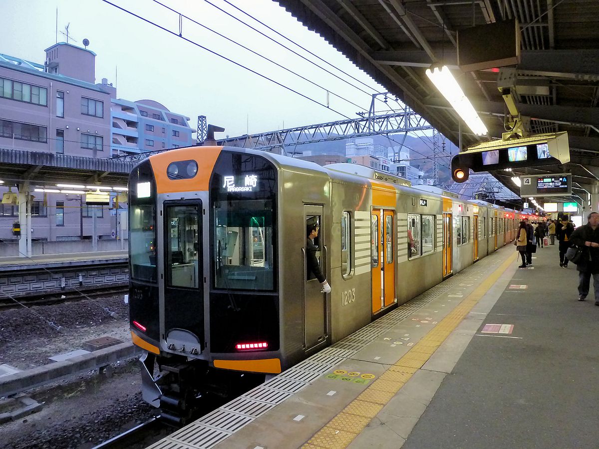 Hanshin Konzern, die Expresszüge mit Kasten aus rostfreiem Stahl, Serie 9000: Nach dem schweren Erdbeben von 1995 und dem Verlust zahlreicher Wagen wurden 1996 fünf neue Expresszüge Serie 9000 gebaut. 1435 mm Spur, Gleichstrom 1500 V. Diese Züge fahren auf der Strecke des Sanyô-Konzerns bis Himeji, und über die Strecke des Kintetsu-Konzerns bis Nara (etwa 33 km östlich von Ôsaka) durch. Im Bild fährt Zug 9203 in Amagasaki ein, 22.März 2014. Peter Ackermann