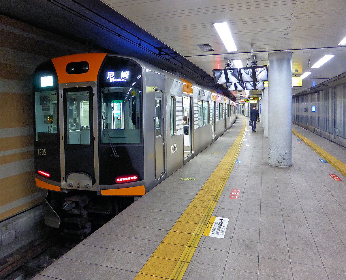 Hanshin Konzern, die Expresszüge mit Kasten aus rostfreiem Stahl: Hanshin-Zug 1205 (Serie 1200) ist über den Kintetsu-Konzern von Nara hergekommen bis zur Personalwechselstelle in Ôsaka-Sakuragawa. Der Kintetsu-Schaffner geht nun davon, und der Zug wird vom Hanshin-Schaffner übernommen.In Japan darf Personal streng nur seine eigene Strecke bedienen. 23.März 2014. Peter Ackermann