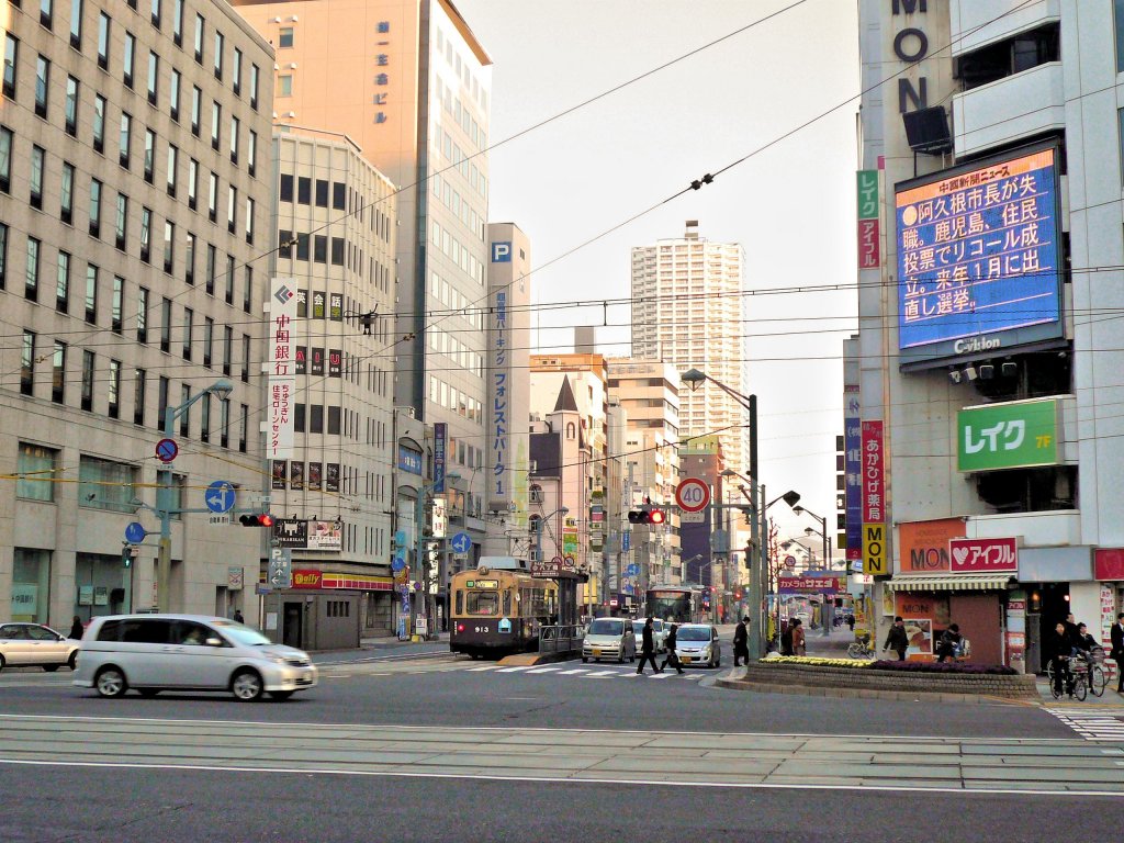 Die ältesten Strassenbahnwagen von Hiroshima - die Wagen aus Ôsaka, Serie 900: Winzig klein inmitten der riesigen Hochbauten des modernen Hiroshima erscheint Nr.913 an der Innenstadt-Endstation Hatchôbori. 6.Dezember 2010. Peter Ackermann