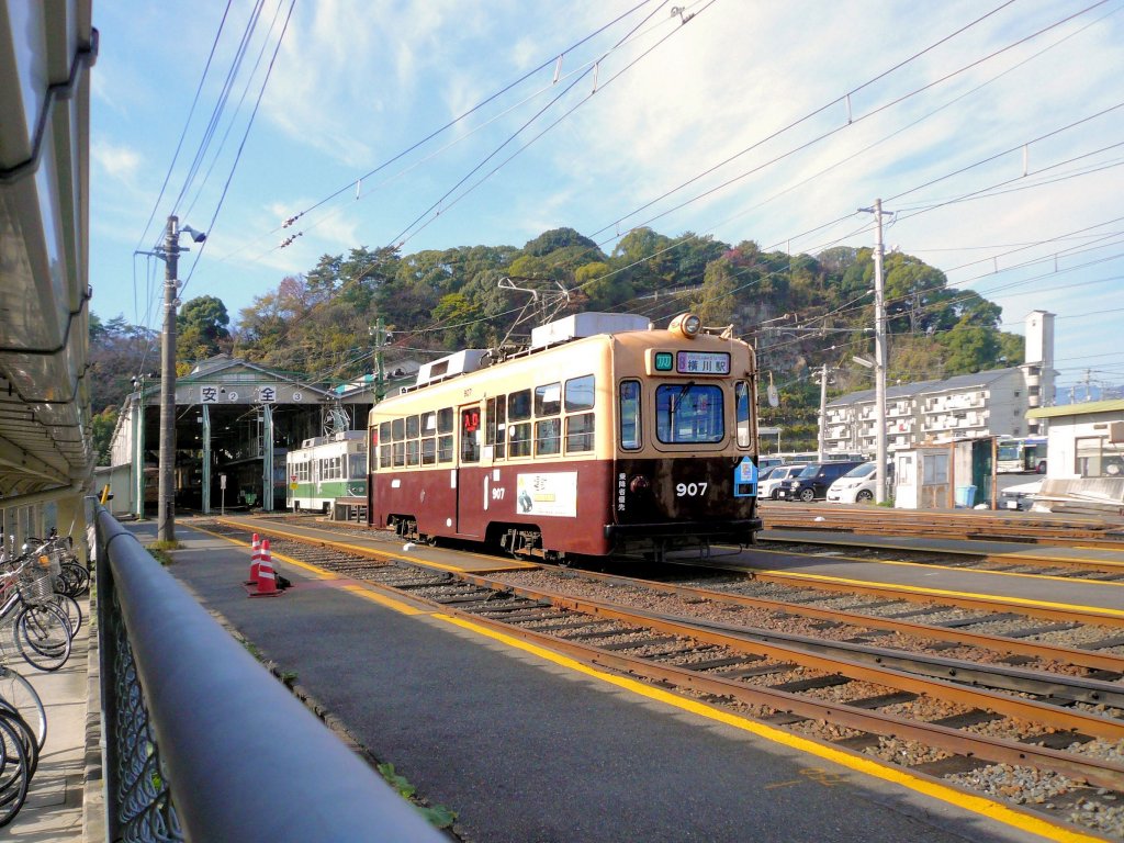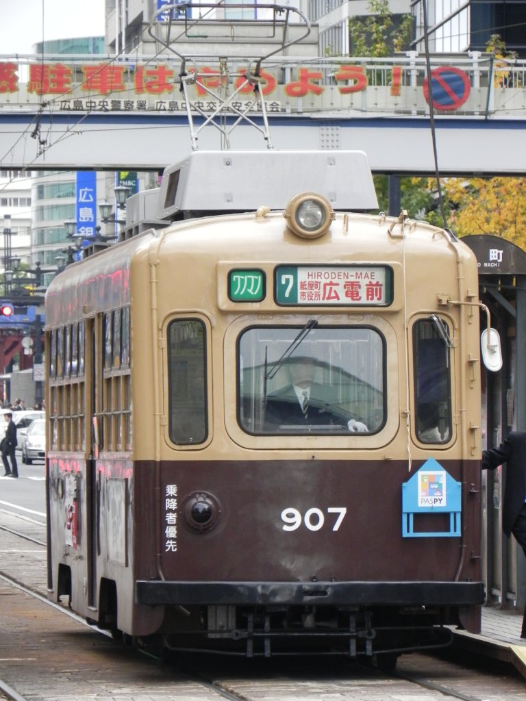 Die ältesten Strassenbahnwagen von Hiroshima - die Wagen aus Ôsaka: Hiroshima übernahm 1965-1969 aus der Grossstadt Ôsaka 40 Wagen, die gleich im Originalanstrich braun in Betrieb kamen. Serie 900 (1955-1961 aus Bestandteilen von Abbruchwagen erstellt) umfasste die Wagen 901-914. Heute sind davon die 9 mit Klimaanlage ausgerüsteten Wagen noch im Einsatz. Im Bild steht Nr.907 in Eba, 5.Dezember 2010. Peter Ackermann
