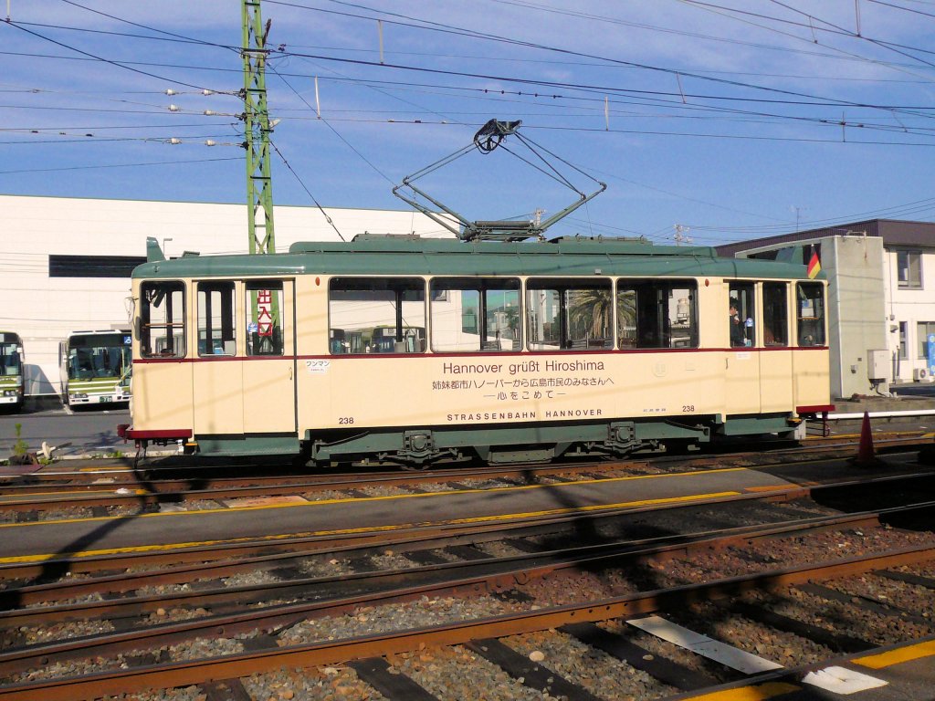 Die ältesten Strassenbahnwagen von Hiroshima - deutsche Wagen: Hiroshima übernahm 1982 zwei dreiteilige Gelenkwagen aus Dortmund (Nr.76-77, Baujahr 1959) und 1988 den Zweiachser 238 aus Hannover. Für die Gelenkwagen waren Unterhalt und Ersatzteilbeschaffung problematisch, so dass Nr.77 im Jahre 2006 abgebrochen wurde, und Nr.76 (2008 stillgelegt) heute ein Restaurant ist. Nr.238 dagegen ist nach wie vor im Einsatz; hier kommt er in Hiroshima-Funairi Honmachi entgegen, 5.Dezember 2010.