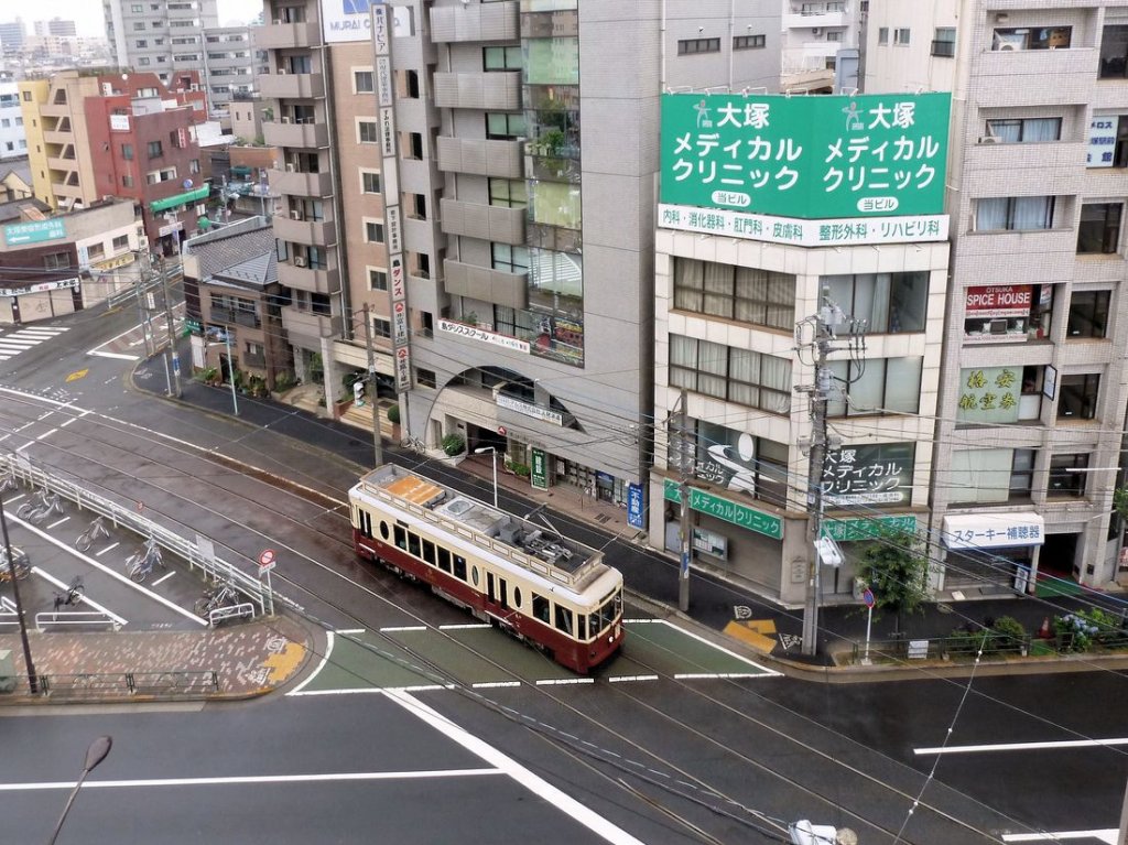 Tokyo Strassenbahn: Ein Blick auf Wagen 9001 von oben zeigt, dass das eindrucksvolle, altmodisch wirkende Oberlicht eine Attrappe ist. Tokyo-Ôtsuka, 23.Juni 2011. Peter Ackermann