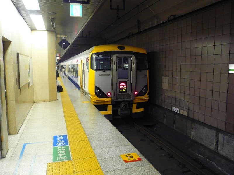 Serie 257: Ein Zug der Serie 257-500 steht im Tokyo Hauptbahnhof bereit. Man beachte die Angaben am Boden, die es den Fahrgästen ermöglichen, sich millimetergenau vor die für ihren reservierten Platz richtige Türe anzustellen. Steuerwagen KUHA 257-508, 2.September 2008. Peter Ackermann