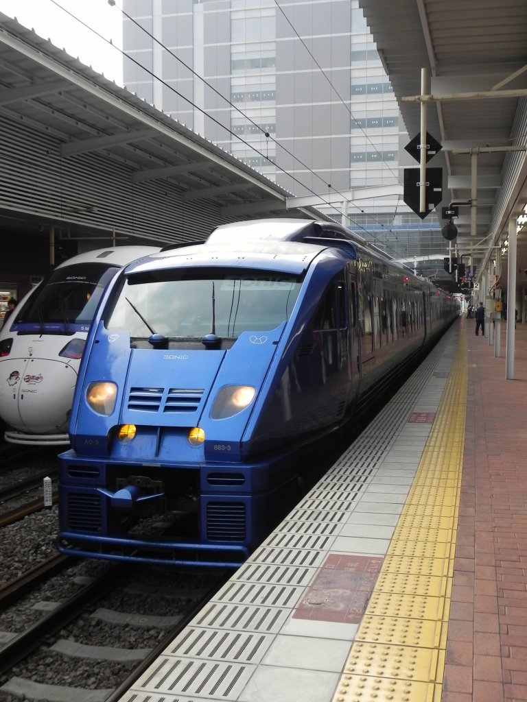Series 883 Inter-City Zug der JR Kyushu im Bahnhof von JR Hakata am 07.11.2010. Dieser Zug verkehrt, neben dem links stehenden Series 885 Zügen, als "Sonic" (ソニック) Limited Express zwischen Hakata und Oita. Jens Hardt