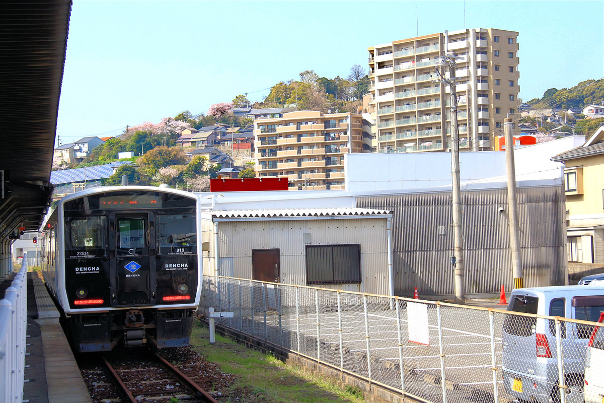 Der Akku-Triebzug BEC 819 von JR Kyûshû: Hier steht Zug BEC 819 Nr.4 an der Endstation Wakamatsu, einst ein riesiges Industriegebiet an einem der Hafenbecken von Nord Kyûshû. Die Zweigstrecke nach Wakamatsu ist nicht elektrifiziert, und so ist der Zug mit Batterieantrieb hierher gelangt. 31.März 2018 Peter Ackermann