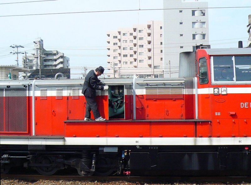 DD51: Ueber den langen Zeitraum 1962 bis 1978 wurden 649 dieser starken Lokomotiven (mit Achsfolge B-2-B) gebaut. Im Jahr 2008 waren noch 108 Maschinen bei der JR im Einsatz. Hier steht DD51 847 vor einer kleineren Lok des Typs DE10 in Yokkaichi, 26.Februar 2009. Peter Ackermann