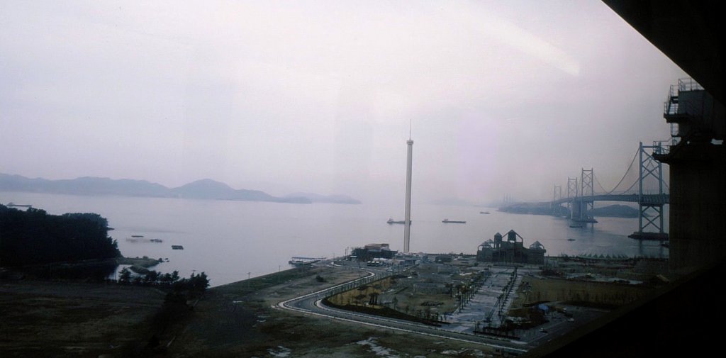 Serie 213: An einem diesigen Abend Blick aus dem Panorama-Steuerwagen KURO 212-4 beim Aufstieg auf die Grosse Seto Brücke von der Insel Shikoku her zur Rückfahrt auf die Japanische Hauptinsel. Sakaide, 25.März 1991. Peter Ackermann