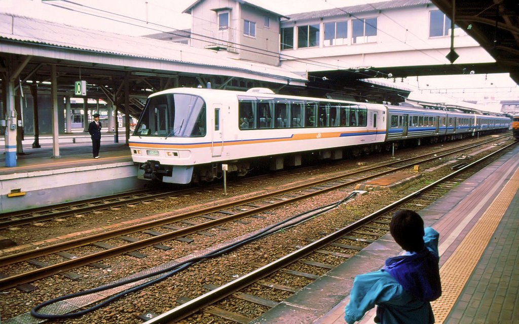 Panorama-Steuerwagen KU-RO 212-4 (クロ212-4)(KUク=Wagen eines elektr.Triebzugs mit Führerstand;ROロ=Wagen der Luxusklasse).5 der 6 Wagen dieses Typs (Baujahr1988)waren bis 2003 den Triebwagenzügen Typ 213 für die Seto Oohashi ("Grosse Seto-Brücke"-)Linie zugeteilt.Seto Oohashi ist die riesige Brücke (Bau 1978-1988;13,1km lang, wovon 9,368km Brücke, der Rest auf kleinen Inseln), die die Hauptinsel Japans (Honshû) mit der kleinen Insel Shikoku verbindet. Aufnahme in Okayama, 25.März 1991. Peter Ackermann
