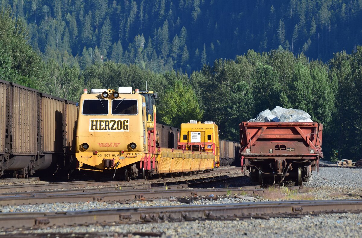 Blick auf den Herzog von Revelstoke. Der Herzog ist eine Mehrzweckmaschine mit vielen Einsatzbereichen. Mit diesem Zug bestehend aus 2 Motorwagen mit Führerkabine sowie 6 Mittelwagen. Auf diesen Mittelwagen kann sich eine Art Bagger bewegen. Der Herzog kann somit 475 Kubikmeter Material transportieren. An den Arm des Baggers kann man viele Anbaugeräte anschließen und somit viele Aufgaben erfüllen. Neben Materialtransport von Alt und Neumaterial und Aushub lässt sich hiermit auch neben dem Gleis planieren oder Vegetation schneiden und entfernen und vieles mehr. Rechts neben dem Herzog steht ein Zug mit größeren Steinen welcher dort schon mehrere Tage steht.