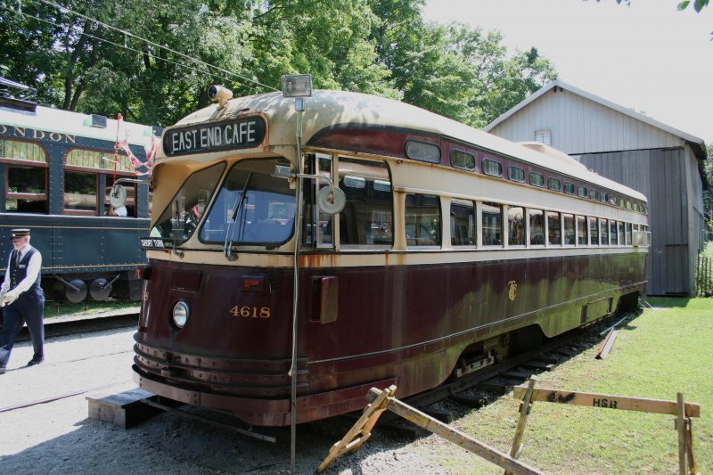 Toronto Transit Commission Class A-15 4618 (Bj 1951 als Class A-8 4501) am 31.7.2009 im Halton County Radial Railway Museum. Diese als Eisdiele/Café benutzte Strassenbahn wartet noch auf eine Restauration.