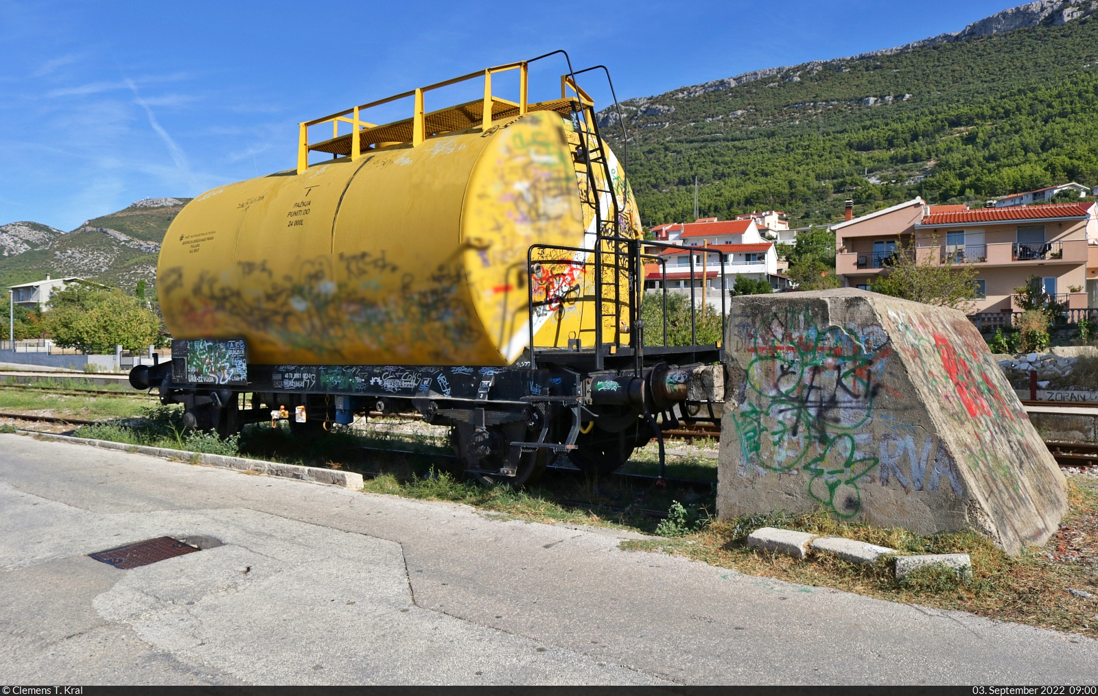 Dieser nicht mehr genau identifizierbare Kesselwagen trägt die Bezeichnung "Ukk-zž" (40 78 9061 xx2). Er ist mit Löschwasser (Kroatisch: voda) gefüllt und steht im Bahnhof Kaštel Stari (HR).