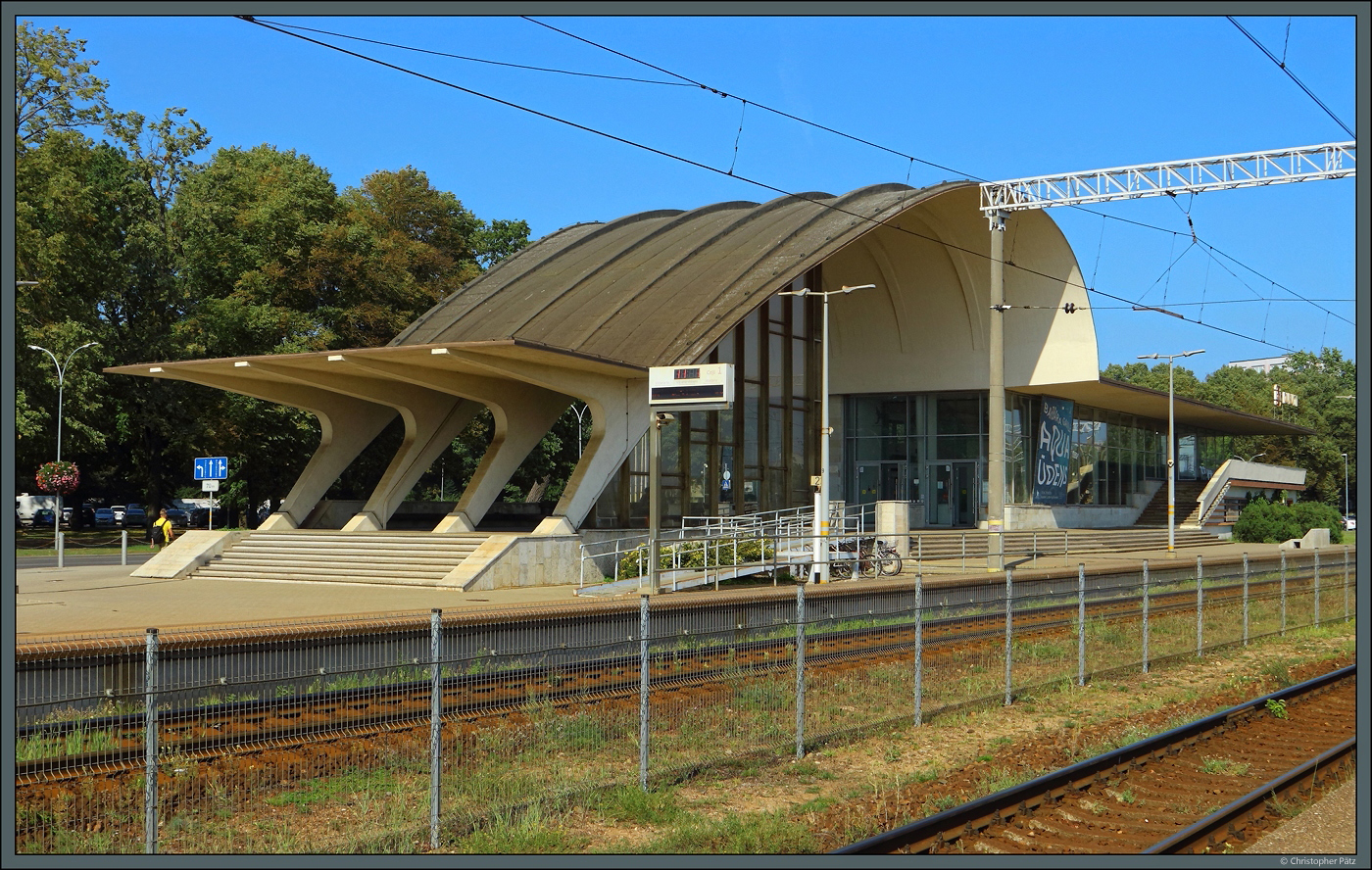 Das Empfangsgebäude des Bahnhofs Dubulti wurde 1977 errichtet. Durch seine Wellenform weist es auf den nahen Strand hin, der schon zu Sowjetzeiten ein beliebtes Ziel war. (Dubulti, 30.08.2024) Christopher Pätz