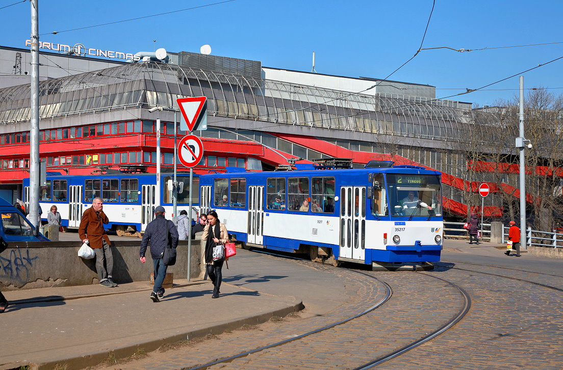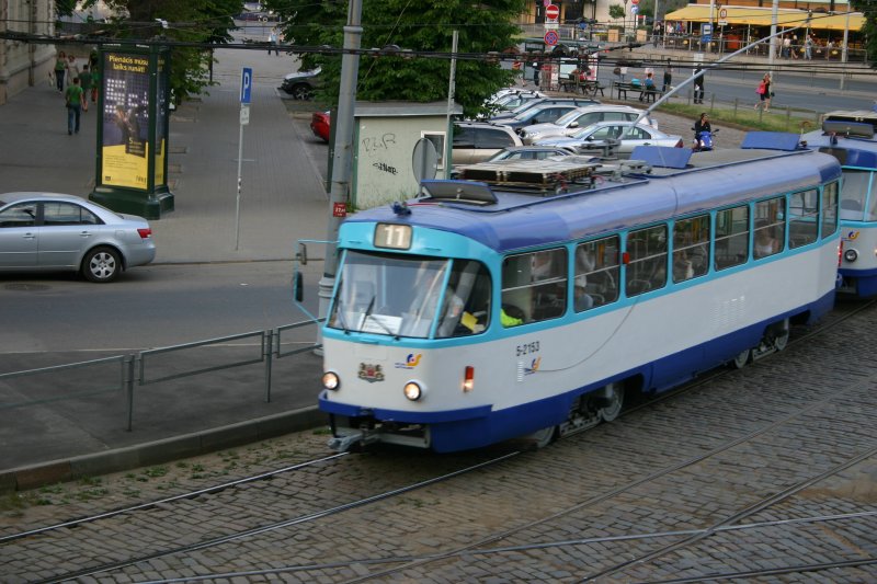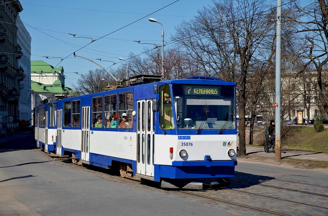 In Lettlands Hauptstadt Riga sind neben modernen Niederflurtrams noch viele Tatra-Straßenbahnen unterschiedlicher Typen im Einsatz. Einer davon sind die Fahrzeuge vom Typ Tatra T6B5, die in Riga als T3MR bezeichnet werden. Ein Gespann mit dem im Jahr 1990 gebauten Wagen 35021 konnte am 14.07.2025 am Zigfrīda Annas Meierovica Bulvāris unweit der Altstadt auf der Linie 11 zur Fahrt nach Ausekļa iela aufgenommen werden.