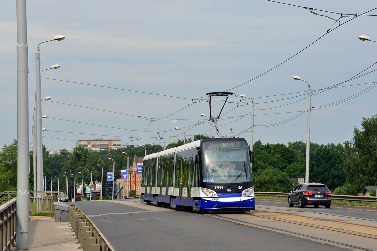 Straßenbahn Škoda 15T2 ForCity Alfa Riga #57594 der Linie 1 am 23.06.2021, Jūrmalas gatve, Rīga.