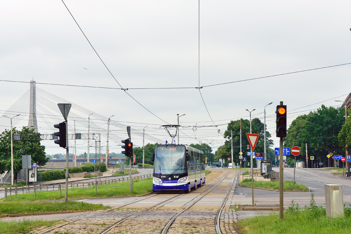 Straßenbahn Škoda 15T2 ForCity Alfa Riga #57594 der Linie 11 am 03.06.2021, Miera iela, Rīga.
