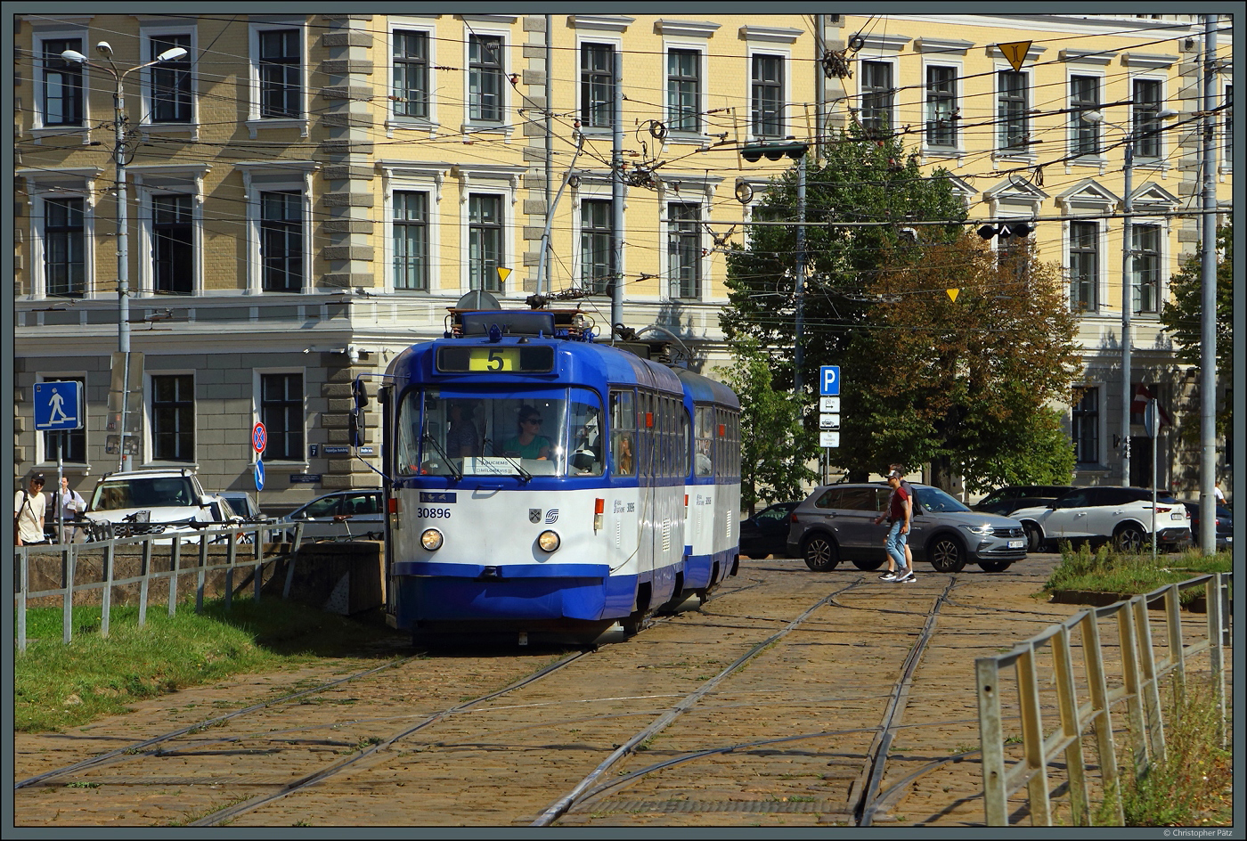 Der T3SU 30896 rumpelt am 29.08.2024 über das Gleisdreieck am Rigaer Hauptbahnhof.