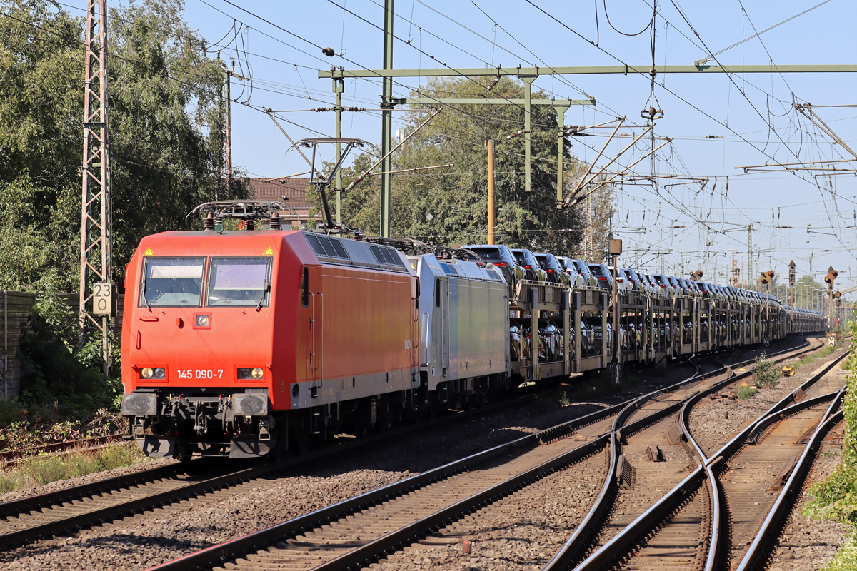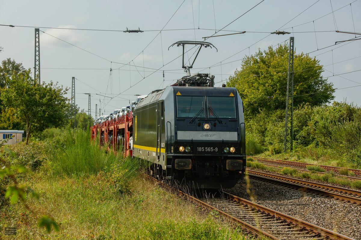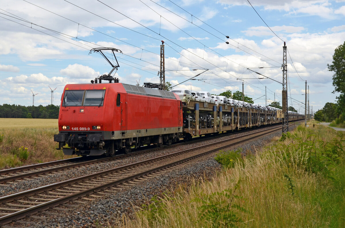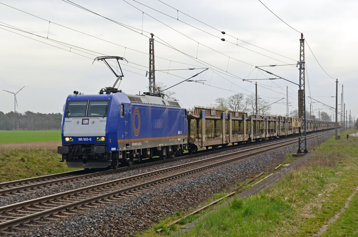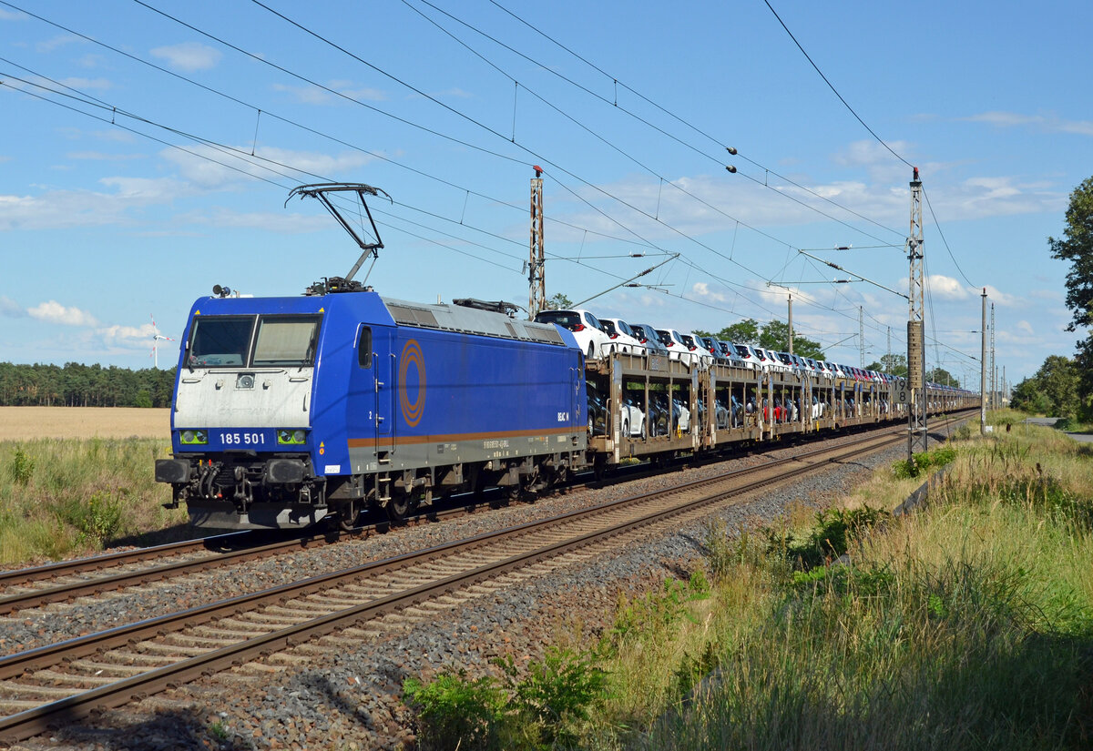 185 501 der BRLL führte am 14.07.24 einen BLG-Autozug durch Wittenberg-Labetz Richtung Dessau. An den grünen Scheinwerfern ist noch der Vorbesitzer Captrain zu erkennen. Martin Schneider