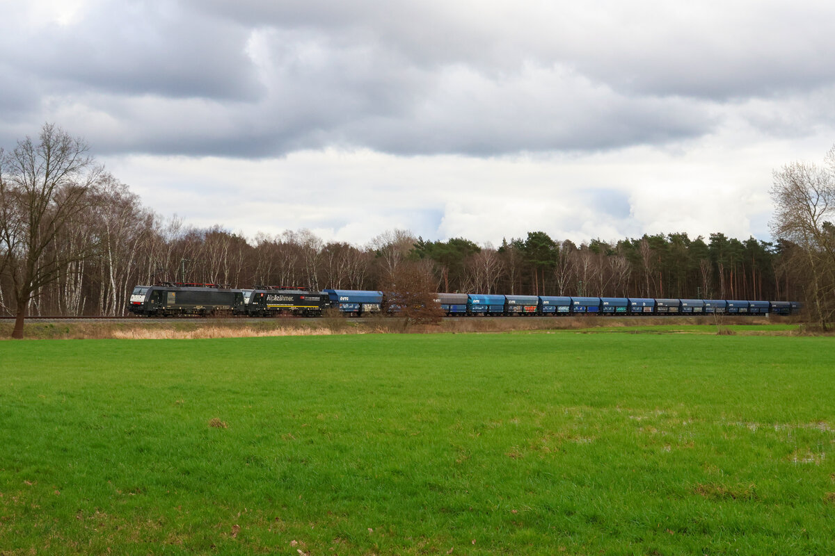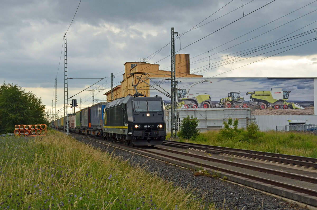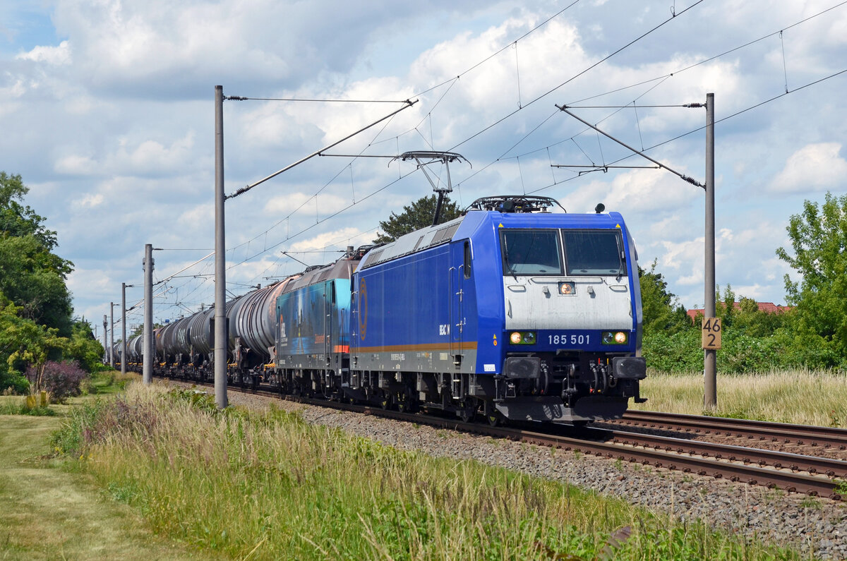 185 501 der BRLL schleppte für die HSL am 18.06.24 einen Kesselwagenzug durch Greppin Richtung Bitterfeld. Als Wagenlok lief der HSL-Nightrider 185 601 mit. Martin Schneider