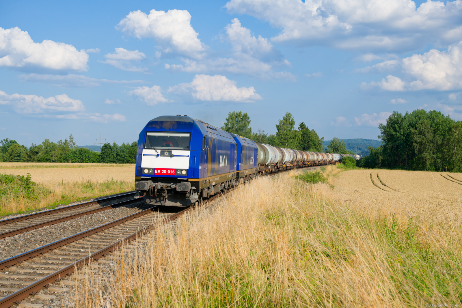 223 001 BeaconRail und 223 015 Beacon Rail ziehen 186 551 Railpool/HSL Logistik "Europa Lok 2.0" mit einem Kesselzug bei Marktleuthen Richtung Marktredwitz, 22.07.2021 Korbinian Eckert
