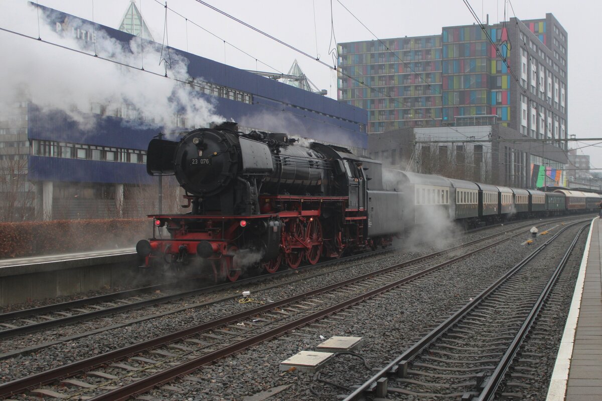 Am feuchtem 15 Dezember 2024 ist VSM 23 076 mit der Christmas-Express Sonderzug in Nijmegen angekommen und wird innerhalb von zehn Minuten nach Arnhem Centraal zurückfahren.