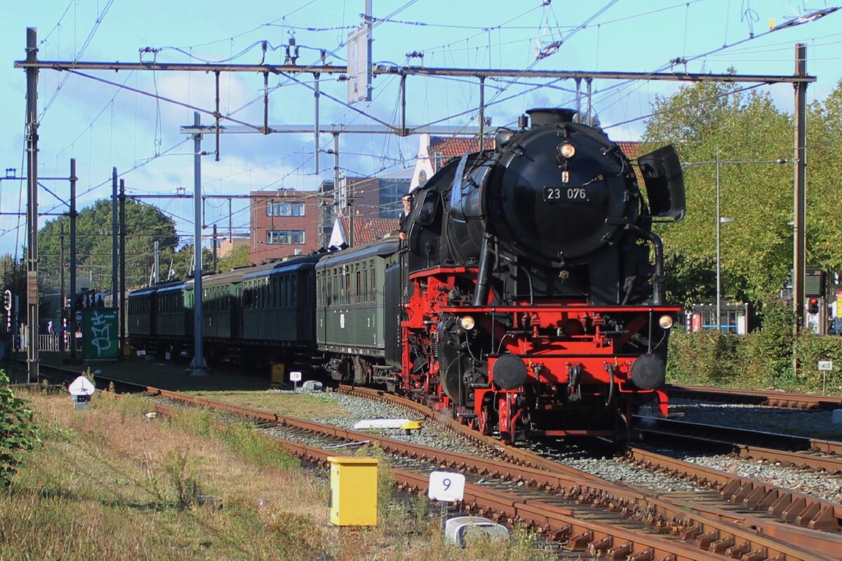 Am Samstag 28 September 2024 wurden drei Dampfpendelzüge zwischen 's-Hertogenbosch und Nijmegen gefahren von VSM's eigener 23 076 und 50 307. Wegen Verspätung müsste jedoch die 1.Dampfpendelzug ausserplanmässig in Oss Halt machen. Hier treft 23 076 mit deren Zug in Oss ein. Das Bild wurde vom offenbarer Parkplats gemacht.