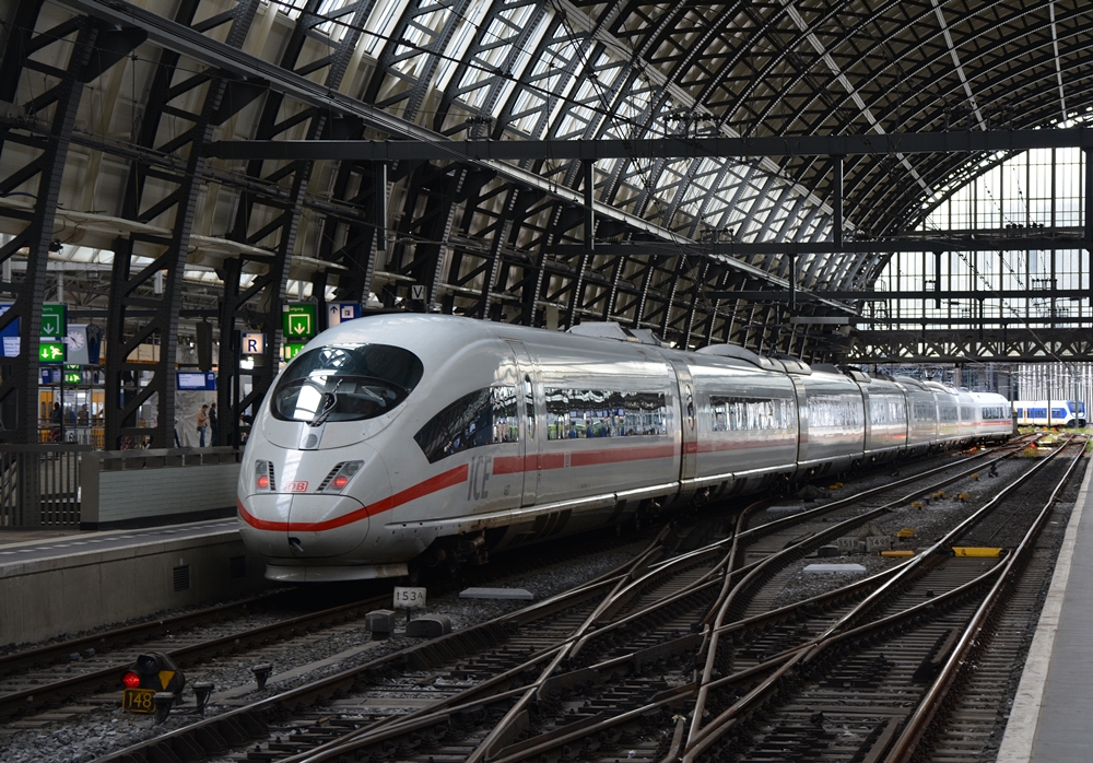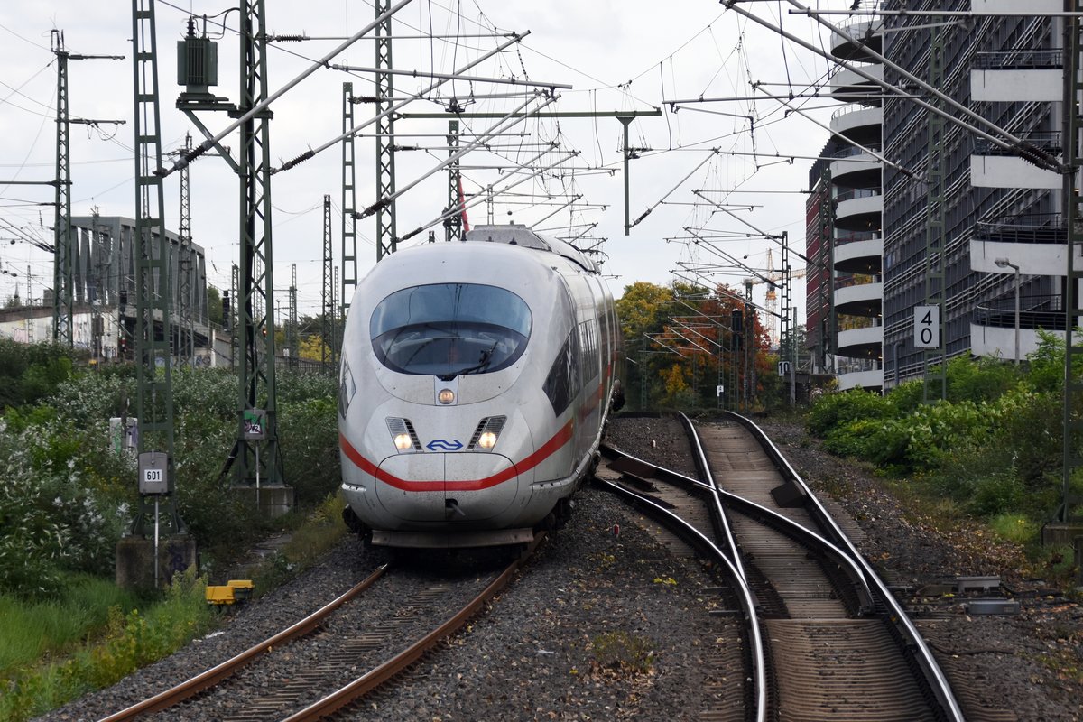 Wegen Bauarbeiten an der Hauptstrecke Düsseldorf und Köln werden die Fernzüge zwischen Düsseldorf-Eller und Köln-Mülheim derzeit über die sonst nur von Güterzügen befahrene Verbindung von Mülheim-Speldorf nach Troisdorf umgeleitet. Am 20.04.2018 fährt ein aus Richtung Düsseldorf Hauptbahnhof kommendes 406-Doppel mit einem NS-Triebwagen an der Spitze über die sonst nur von S-Bahnen befahrene Verbindungsbahn zwischen der Hauptstrecke und Düsseldorf-Eller in Richtung Köln. Horst Lüdicke