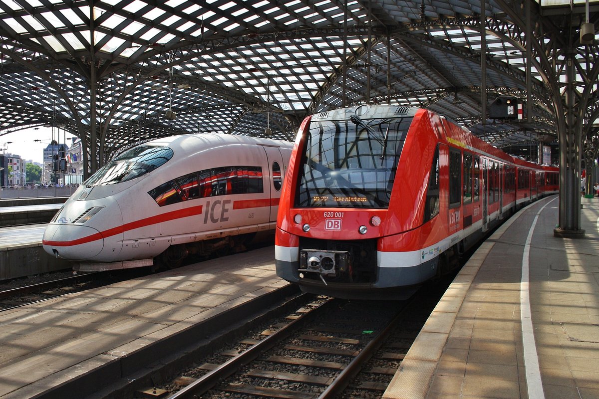 406 051-3 "Amsterdam" trifft am 4.7.2017 als ICE17 von Bruxelles Midi nach Frankfurt(Main) Hauptbahnhof im Kölner Hauptbahnhof auf 620 001-7 als RB24 (RB11431) "Eifel-Bahn" von Köln Messe/Deutz nach Gerolstein. Alexander