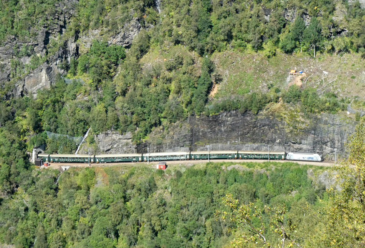 Der Touristenzug von Flam nach Myrdal an der fotogenen Stelle zwischen den Stationen Blomheller und Kjosfossen in der Nachmittagssonne, fotografiert vom Wanderweg auf der gegenüberliegenden Talseite. Myrdal, 31.8.2024 Markus Gmür