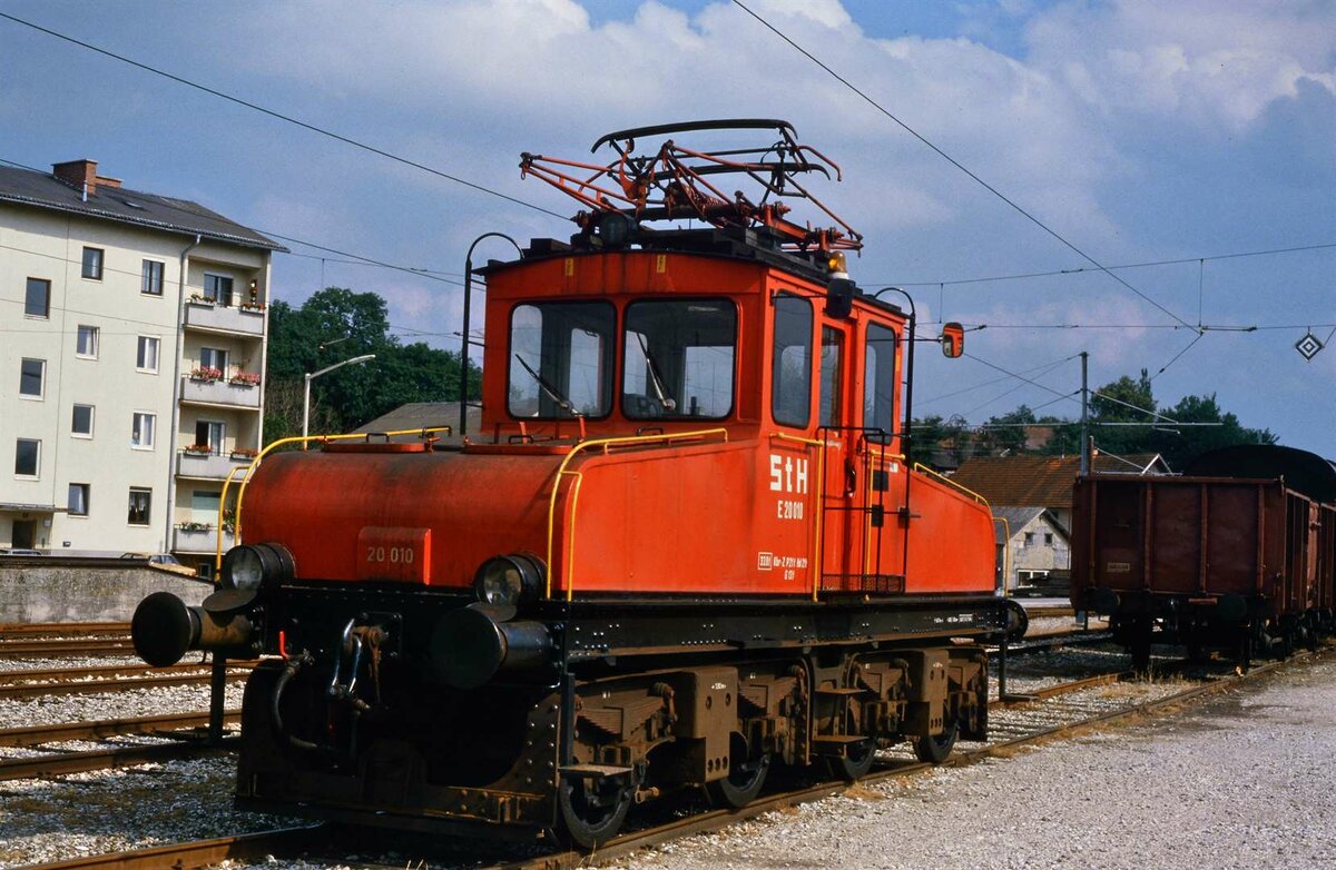 Hauptwerkstätte Vorchdorf (StH): ET 20.105 (von 1908!) sollte wohl dort wiederhergerichtet werden (06.04.1986). ET 24.102 StH neben ihm gab da schon einen besseren Eindruck ab. Die Wagenremise und Hauptwerkstätte Vorchdorf verfügt über zwei verschiedene Spurweiten. Auf dem Foto haben wir die normalspurige Wagenremise der Lokalbahn Lambach - Vorchdorf-Eggenberg. Frank Nowotny
