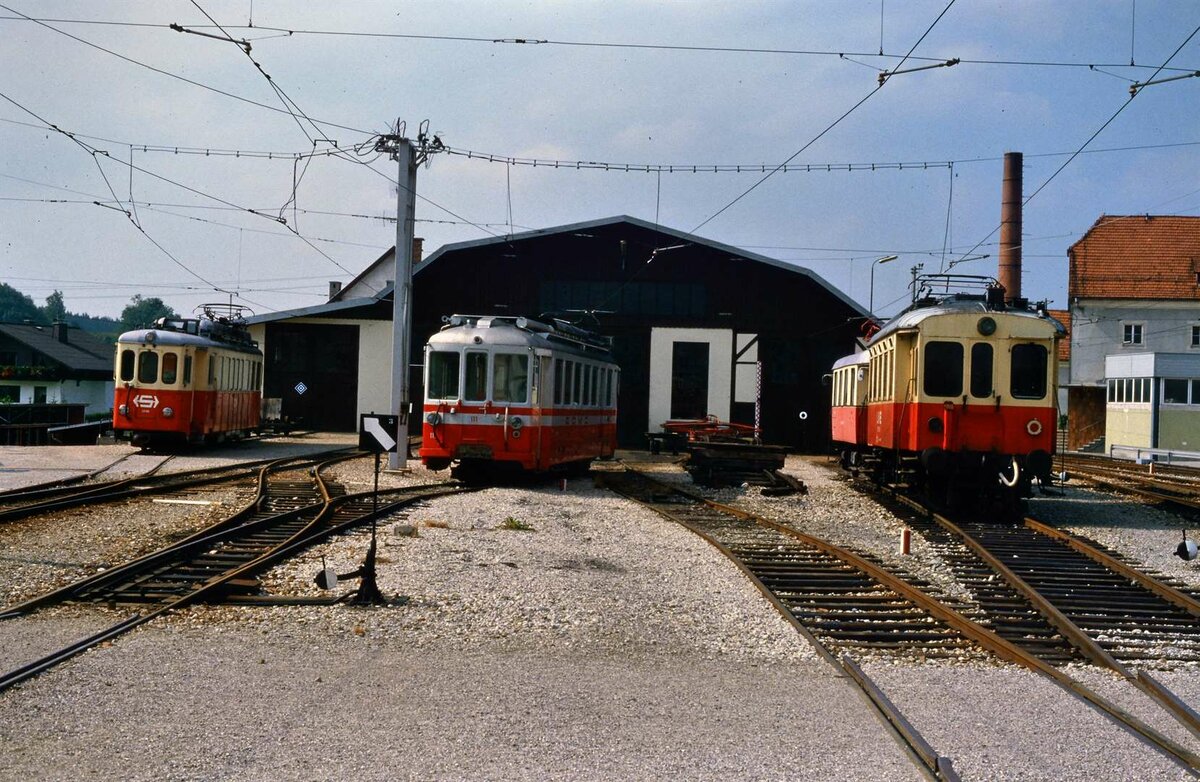 Eine Hauptwerkstatt (StH) mit zwei verschiedenen Spurweiten und zwei unterschiedlichen Bahnlinien: Vorchdorf (06.04.1986). Im westlichen Bereich zwei ETs der schmalspurigen Lokalbahn Gmunden-Vorchdorf, rechts daneben ET 24 102 StH der normalspurigen Lokalbahn Lambach - Vorchdorf-Eggenberg (Vorchdorferbahn). Frank Nowotny